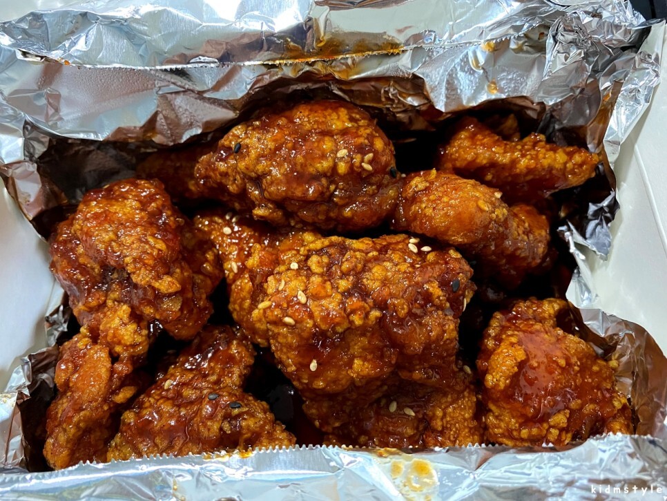 뼈 있는 후라이드, 양념 반반을 주문하였다. 기본 구성이다. 오른쪽 감자튀김과 사라다는 리뷰 서비스이다. 배민에 보니 이 집 오픈한지 5년 정도 되었다네? 서대골목시장 입구 쪽에 있어서 지나갈 때 수없이 봤는데 막상 집에서 치킨 주문할 때는 생각을 안 했던 것 같다.