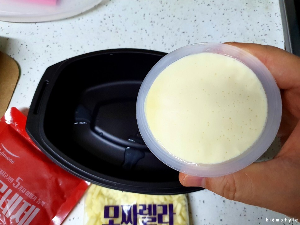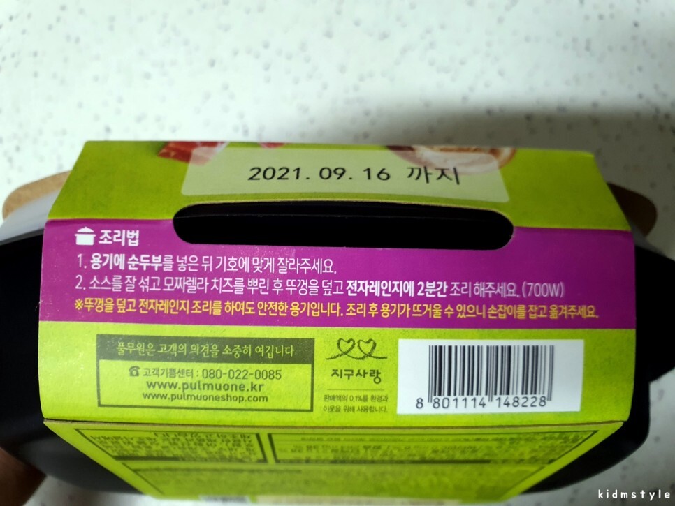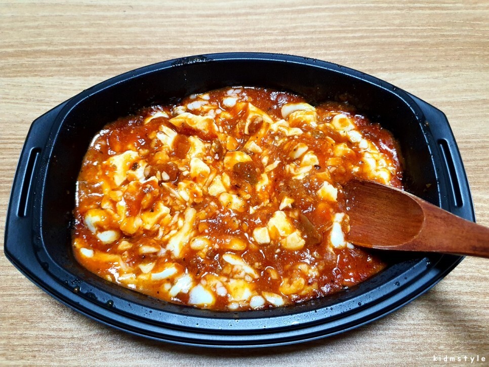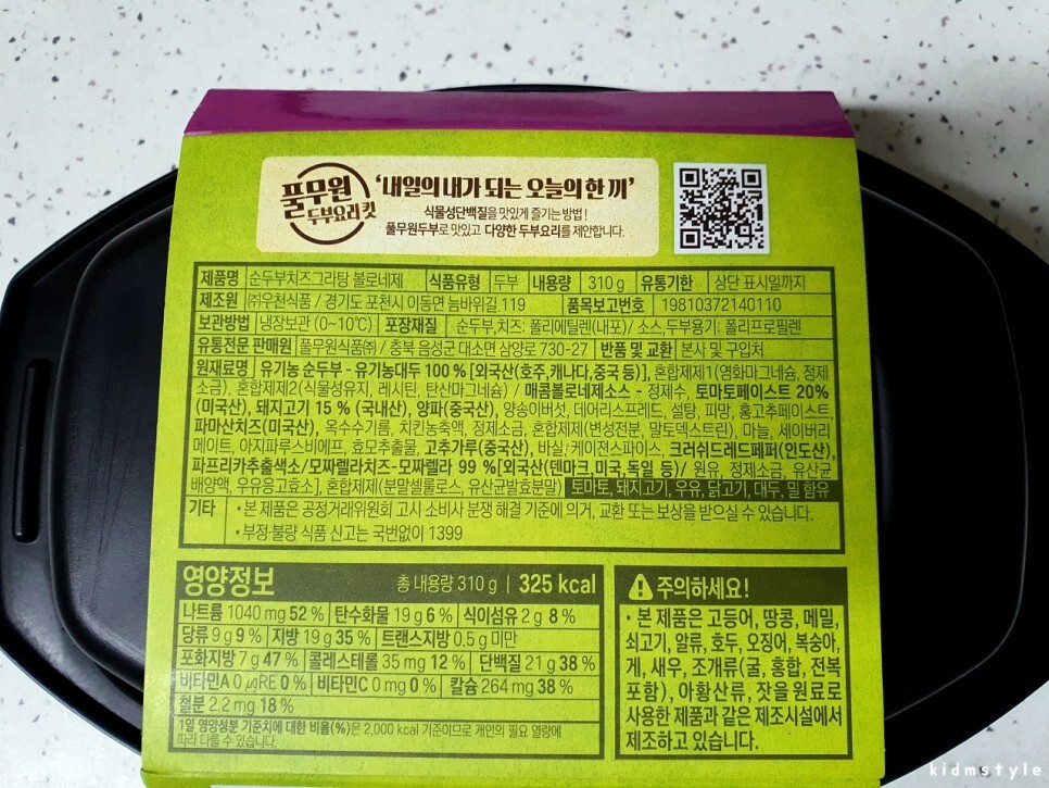 국내산 돼지고기와 5가지 야채가 듬뿍 들어간 볼로네제 소스, 모짜르트 아니 모짜렐라 치즈, 그리고 떠먹는 유기농 순두부로 구성되어 있다. 소스와 치즈는 유통기한이 여유가 있는데 순두부 때문에 유통기한이 짧은 것 같다.