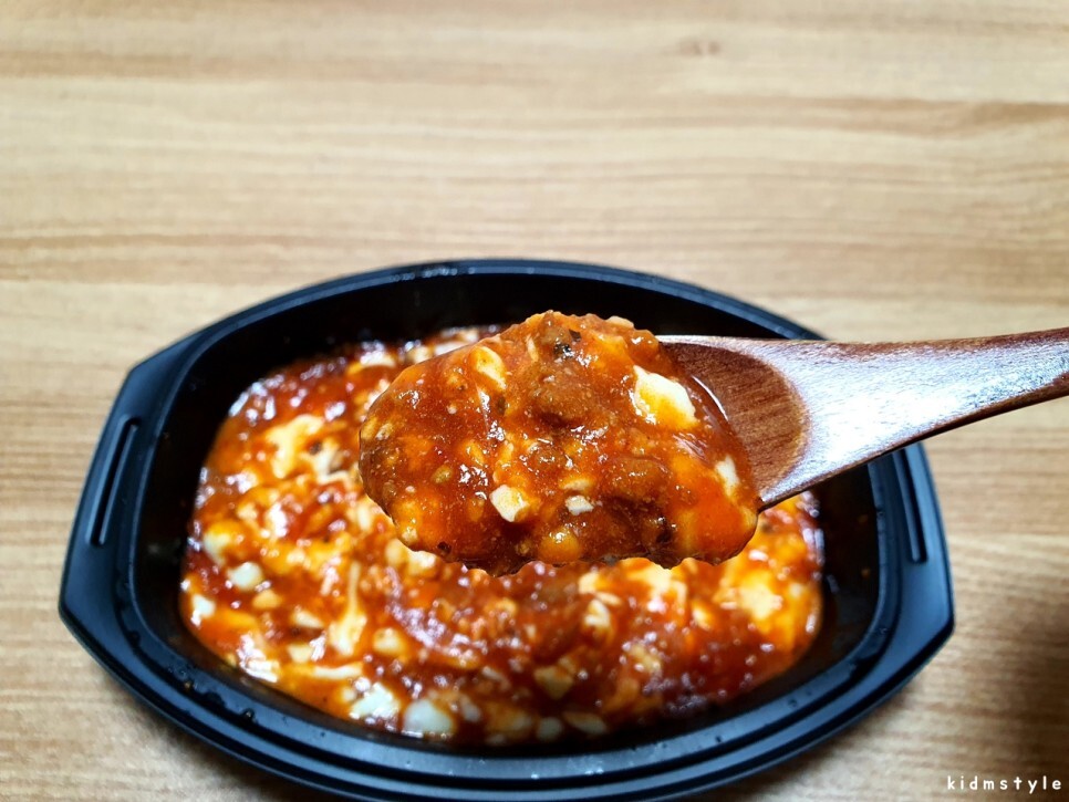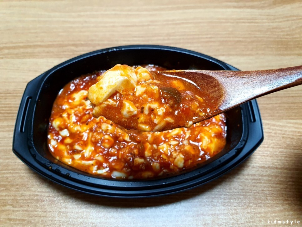 음 뭐랄까? 4,900원 주고 사 먹기에는 조금 돈x랄의 느낌적인 필링이 나타나는 부분이다. 하지만 3천 원 대에 온라인 구매를 한다면 꽤 괜찮을 것 같기도 하다. 천천히 맛을 보니 이 제품은 순두부 특유의 차분하면서 머릿속에 '이 음식은 힐링이다~'라고 강요하는 듯한 메시지와 '이거 먹으면 살 안 찐다~'라는 메시지를 주기적으로 나에게 던져주는 듯한 몸에 좋은 음식이라는 느낌이 강하다. 물론 맛도 강하지 않고 적당하게 간이 잡혀 있으면서 순두부 특유의 부드러움과 소스의 조화는 구미를 당기게 한다. 성인 남자 기준으로 이 제품 단독으로 한 끼로 배 채우기에는 아주 부족한 부분이다. 밥 한 그릇 추가하면 한 끼로 충분할 정도이다. 어쨌든 몸에 좋을 것 같은 제품이고 맛도 무난하고 괜찮아서 한 번쯤 사 먹어볼 만하다. 다음에는 뽀모도로 제품을 구입해 볼 생각이다.