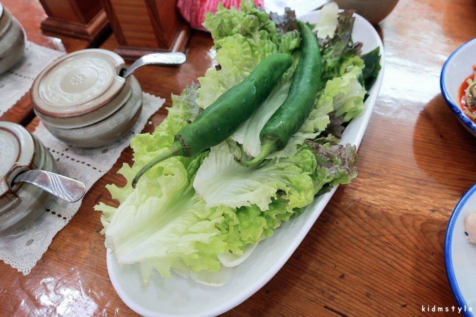 상추 등 쌈 채소와 고추, 왼쪽에 양념통에서 필요한 양념을 덜어 먹으면 된다.