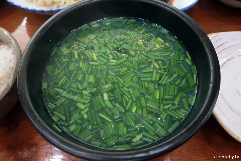 재첩국부터 보자. 부추가 둥둥 떠있고 상당히 깔끔한 인상이다. 재첩국이 다 그렇다. 깔끔하다.