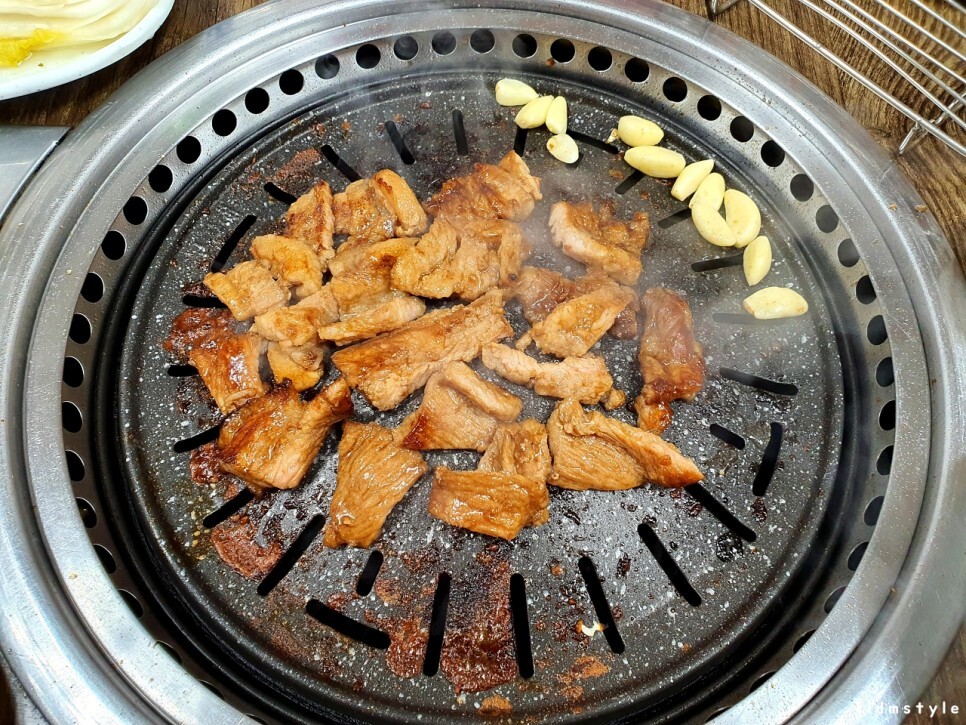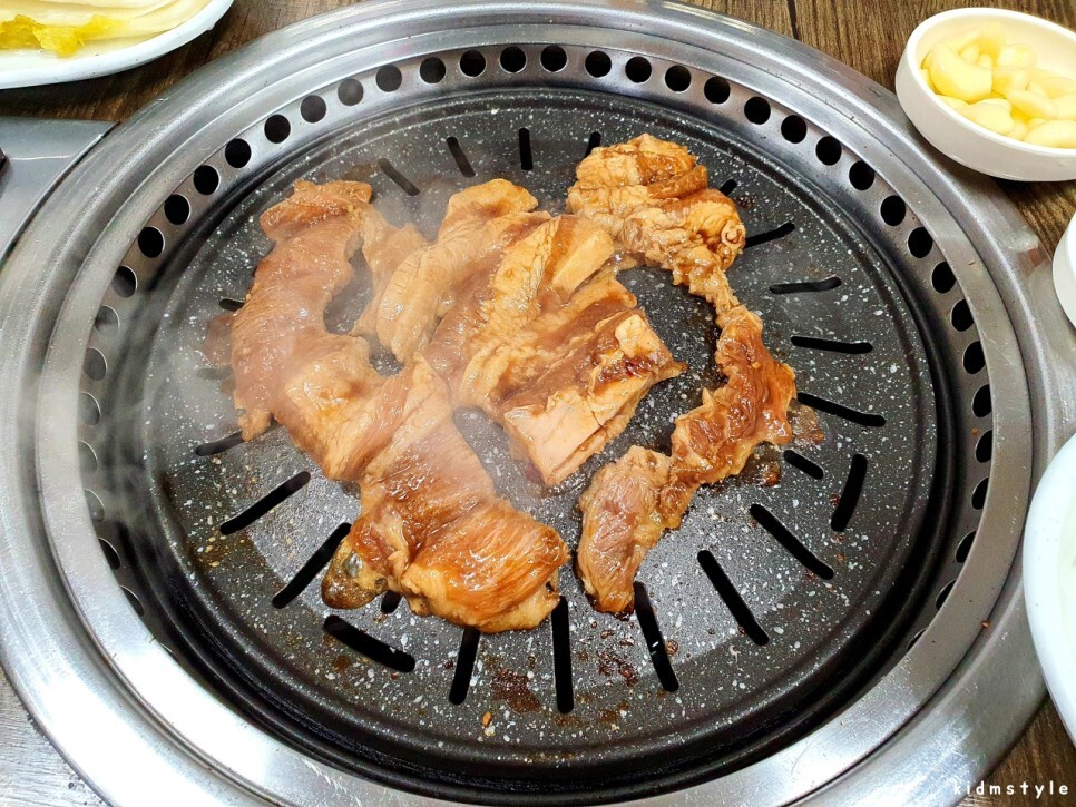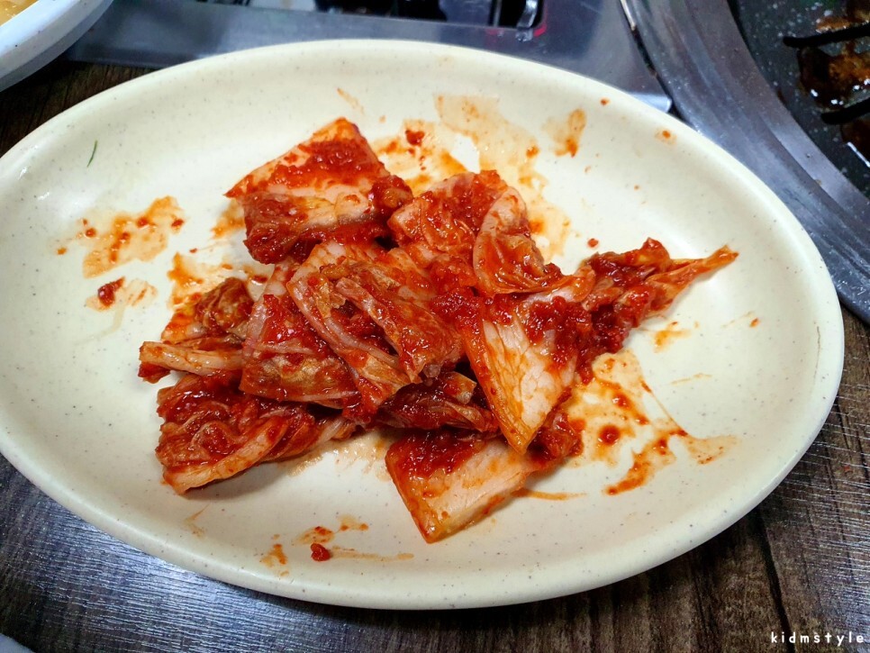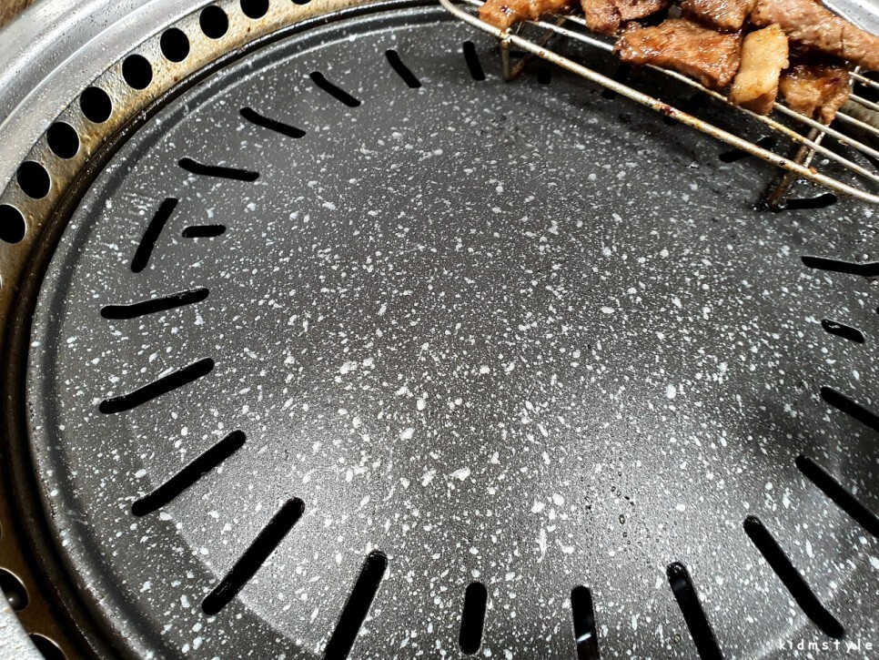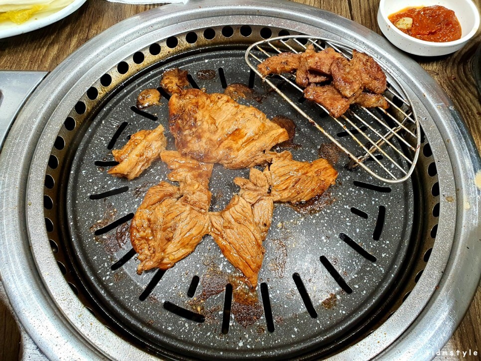 중간에 불판 정리도 한번 해준다. 이 집은 코팅이 좋은 불판을 사용한다. 양념 고기 불판 코팅이 이 정도는 되어야 한다.