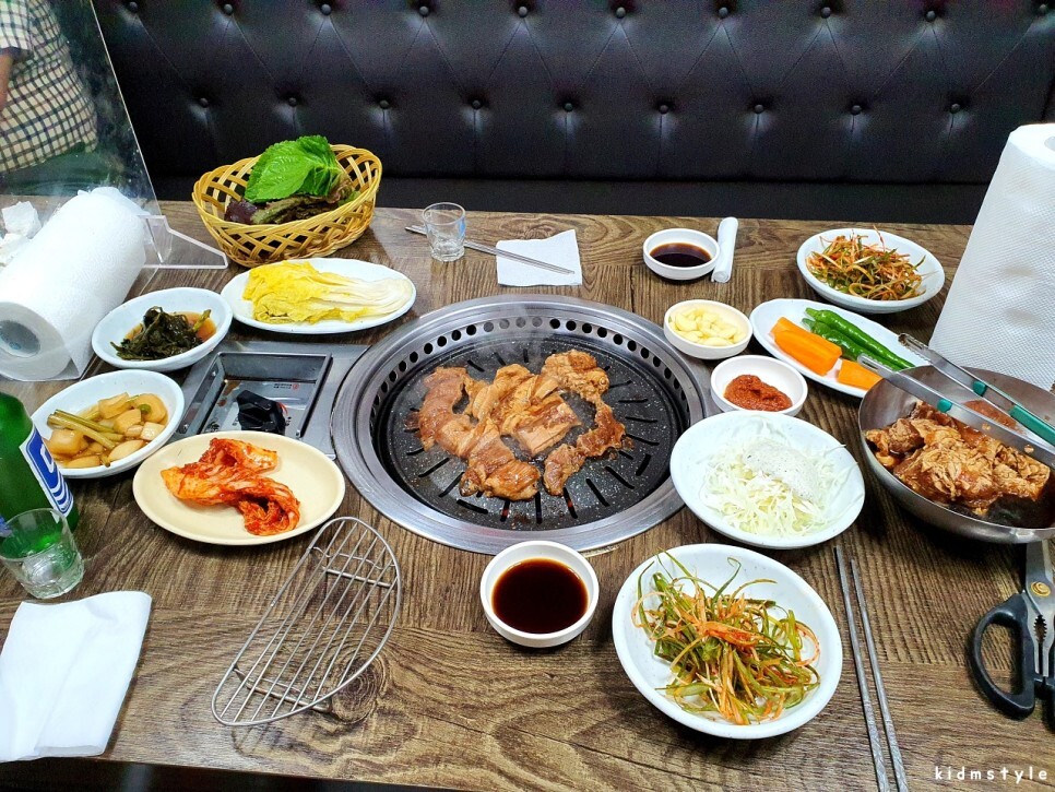 먼저 도착해서 구우면서 소주 한잔해본다. 주위를 둘러보니 손님들 대부분은 5~60대이다. 젊은이는 우리 테이블뿐, 이 집에서 오래간만에 느끼는 시끌벅적함이다. 9월 초, 이때만 해도 아직 나는 백신을 1차도 맞지 않은 시점인데 크게 개의치는 않았다. 기본으로 깔리는 반찬들은 간이 세지 않고 맛이 좋다.