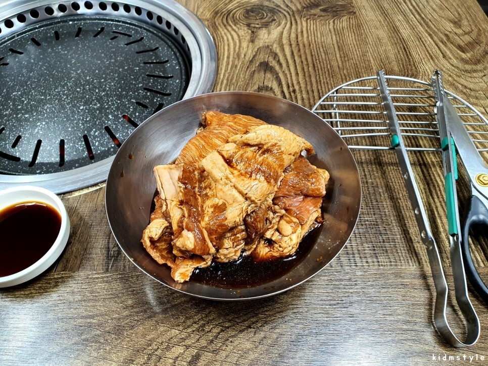 옆 테이블이 빠지고 메뉴를 찍어보았다. 1인분에 9천 원이다. 고기는 모두 국내산이다. 간혹 돼지갈비를 수입산을 쓰는 집이 있는데 맛만 좋으면 된다는 생각이다. 저렴하면 찾아가기도 한다. 하지만 손님에게 팔 때 국내산과 수입산을 같은 가격으로 파는 건 조금 아니지 않나하고 곰곰이 생각해 본다. 멕시코산, 칠레산 등 수입산 돼지고기가 국내산에 비해 상당히 저렴하다는 건 이제 누구나 다 아는 사실인데 말이다. 단가 자체가 차이가 나는데 가격을 같이 하는 건 욕심이라는 생각 밖에 안 든다.