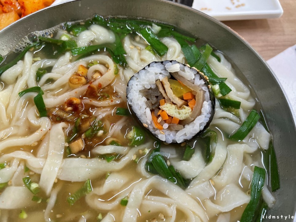 국물에 김밥 하나 적셔서 먹어본다. 국물이 시원한 게 맛있다. 칼국수는 반 정도 남겼다. 양이 너무 많다.