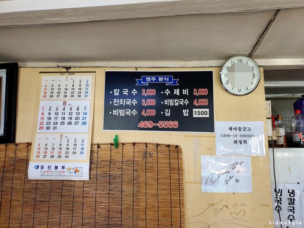 정말 오래간만에 영주시장에 칼국수를 먹으러 갔다. 아직은 더웠던 9월 말 어느 날 이야기이다. 영주시장에는 입구의 현대칼국수, 영주손칼국수, 진아집, 종필이네, 누나야분식 등 다양한 집이 있다. 맛은 거기서 거기다. 다들 맛있으니 어디를 가도 비슷하다고 본다. 오늘은 영주집, 영주손칼국수, 영주분식이라 부르는 영주손칼국수로 가본다.