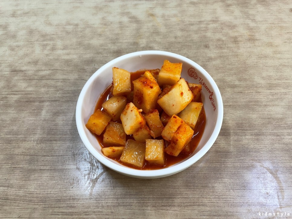 깍두기가 나오는데 이 동네 어느 집을 가도 깍두기가 맛있다. 다들 직접 담그는 깍두기이다.