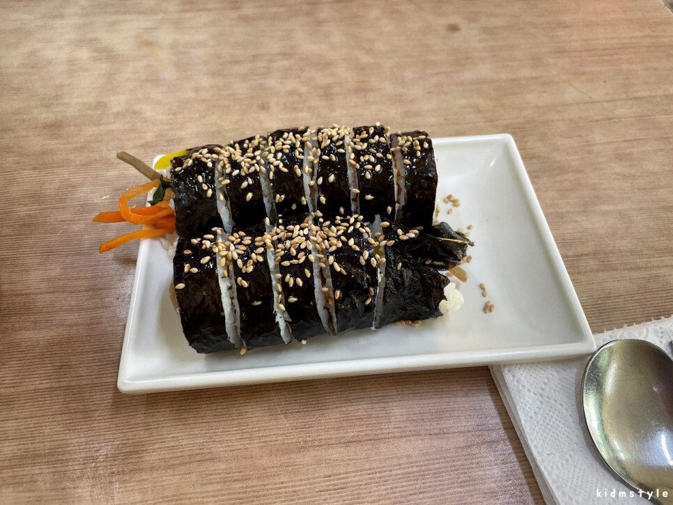 한 줄에 천원하던 김밥이 올라서 1,500원이지만 가성비가 참 좋다. 소시지나 햄은 들어가지 않은 투박한 옛날 김밥 스타일이다. 김밥 전문점의 3천 원 이상의 김밥과 비교하면 속에 들어가는 재료의 차이가 있어서 조금 아쉬울 수는 있으나 사실 큰 차이가 없다.