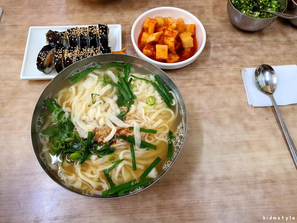 왼쪽 식당으로 들어가 자리를 잡았다. 점심시간이라 사람이 꽤 많다. 칼국수 2그릇, 김밥 한 줄을 주문했고 주문이 밀려서 조금 오래 기다렸다.
