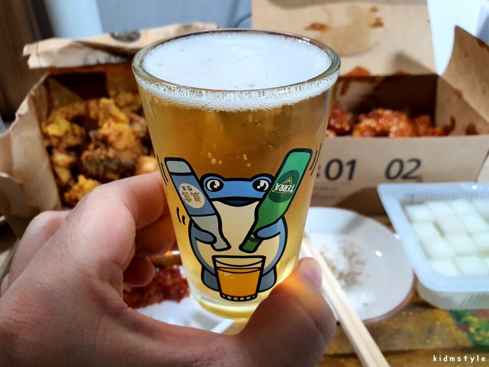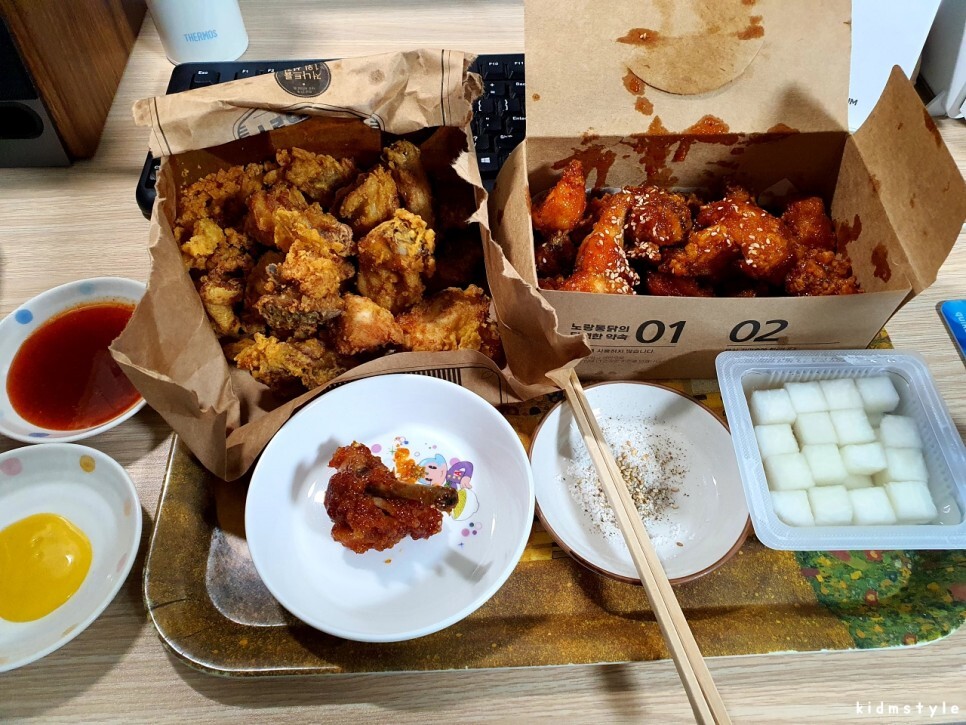 이렇게 차려놓으면 마음이 편하다. 한 마리 시키면 한자리에서 다 못 먹는다. 3/5를 먹고 2/5는 다음날이나 그 다음날 저녁으로 먹는 편이다. 남은 치킨은 에어프라이어에 데워서 먹으면 꿀맛이다.