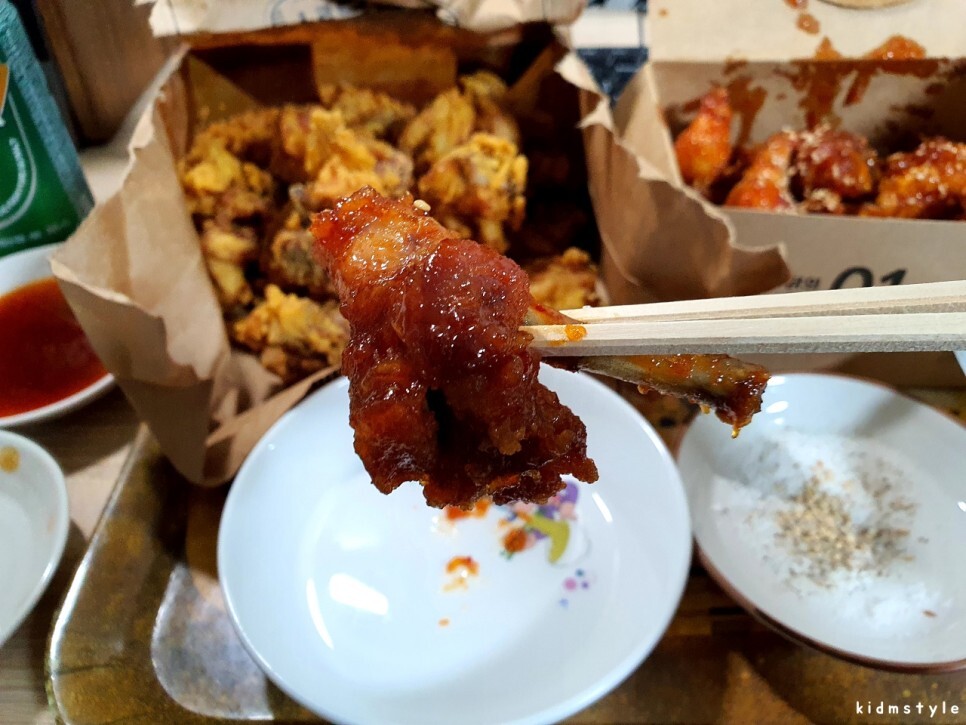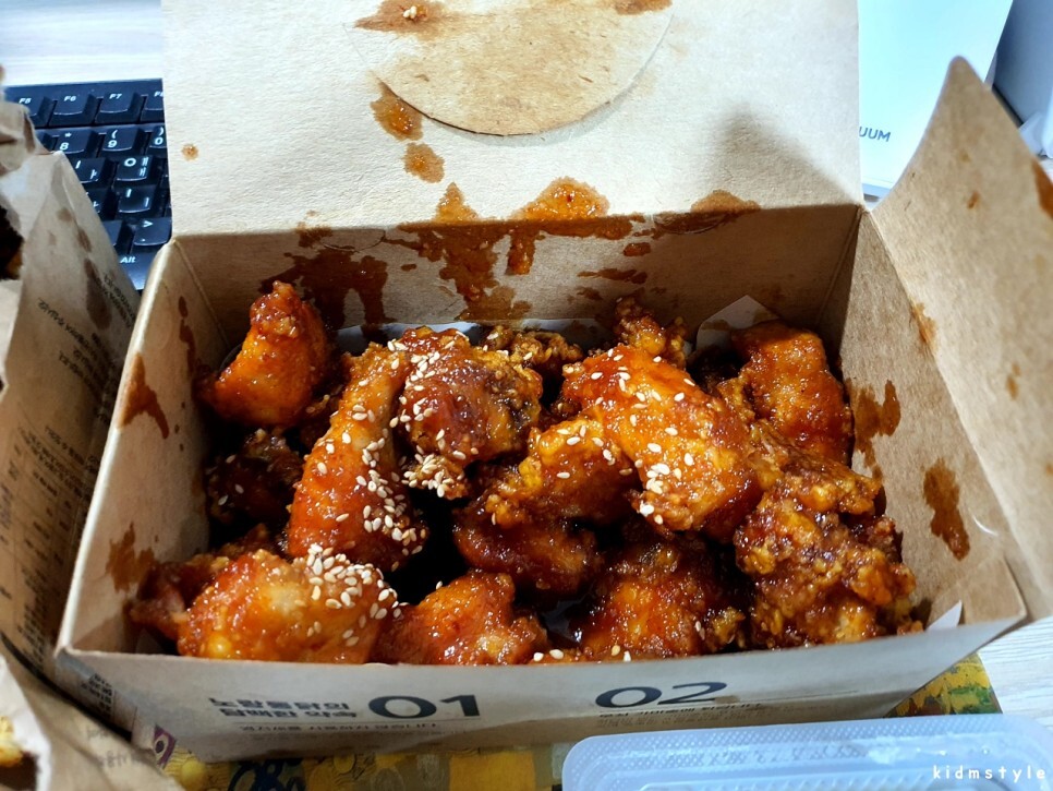 양념치킨도 괜찮다. 양념이 달지 않아서 덜 물리는 편이다. 약간 매콤함도 있어서 먹기가 참 좋다.