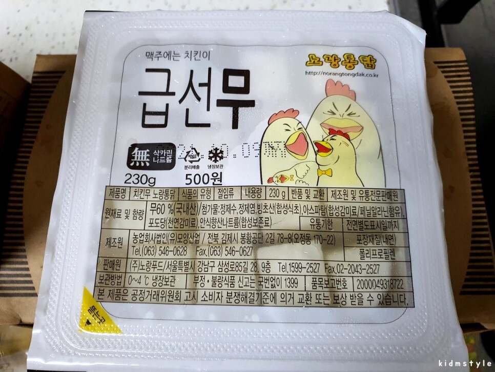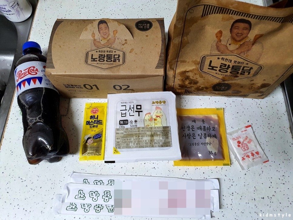 뼈 있는 양념반, 후라이드반을 주문했다. 기본으로 딸려 오는 것들이다. 노랑통닭은 배달의 민족 주문 시 리뷰 이벤트를 하지 않는다. 그래서 거의 이렇게 기본으로 배달 올 것이다.