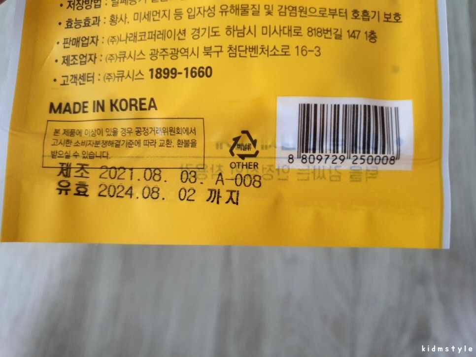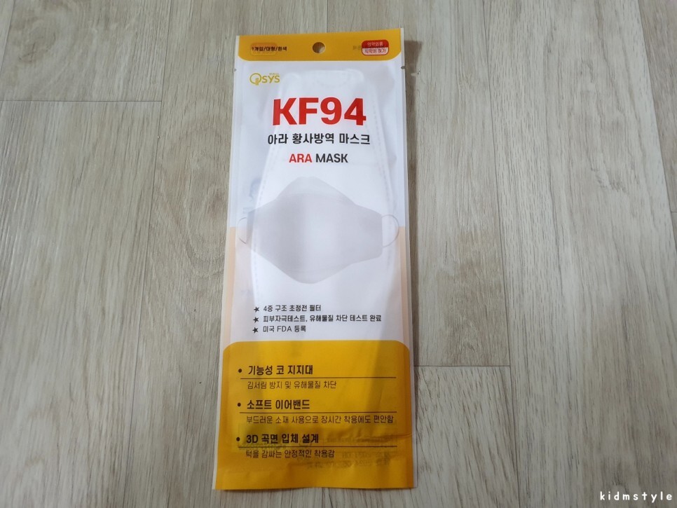 이 제품의 장점은 개별 포장이 되어 있다는 점이다. 제조사에서 밝히는 특징을 몇 가지 적어본다. kf94 4중 구조 필터 포함 자재가 100% 국내산이고 kf94인데 두껍지가 않아서 답답하지 않고 타사 제품보다 넉넉한 사이즈라 장시간 착용해도 귀가 아프지 않은 편안한 마스크라고 한다. 그리고 식약처 허가 (의약외품), 피부 자극 테스트, 유해 물질 차단 테스트 완료, 미국 FDA 등록 등의 특징이 있다.