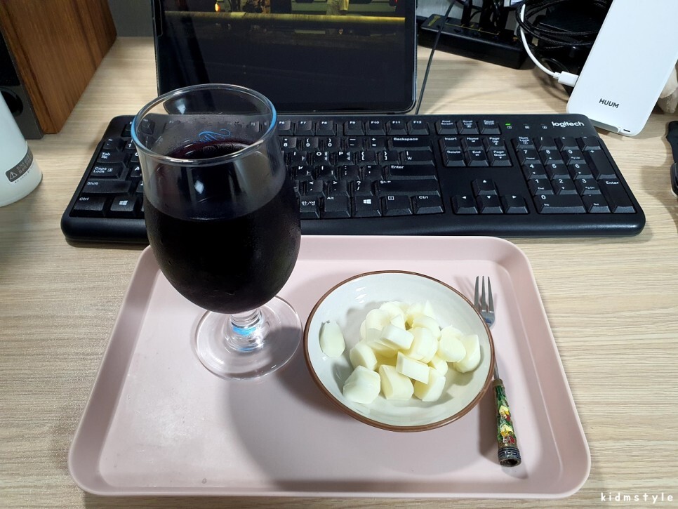 안주를 뭘로 할지 고민하다가 냉장고에서 스트링 치즈를 꺼내서 잘라왔다. 한번 먹어보자.