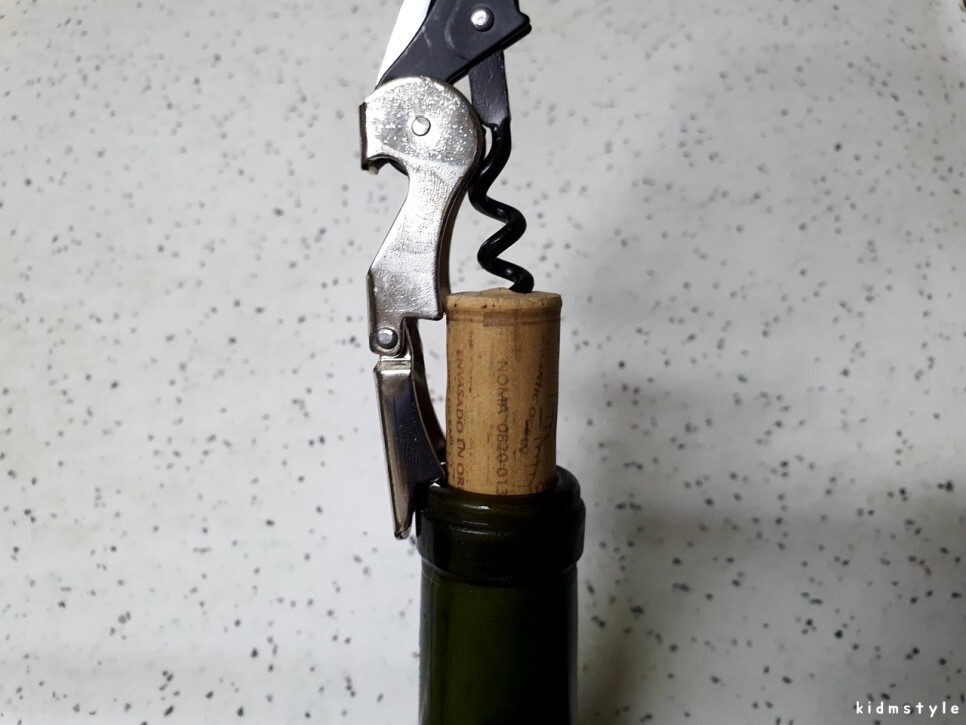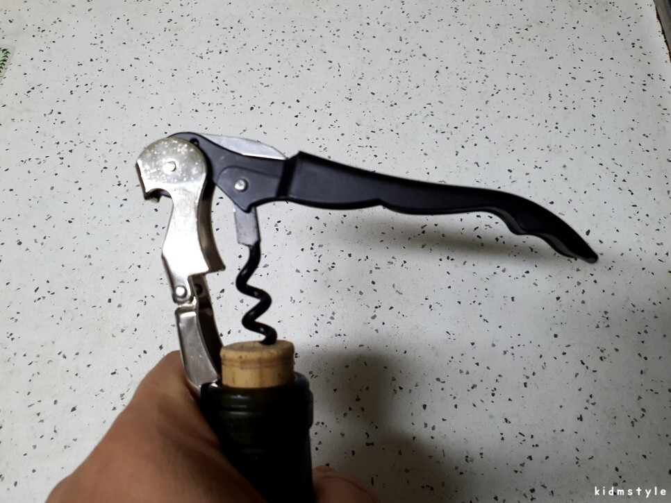 걸쇠 부분을 병 입구에 걸고 밀면 코르크가 올라오기 시작한다.