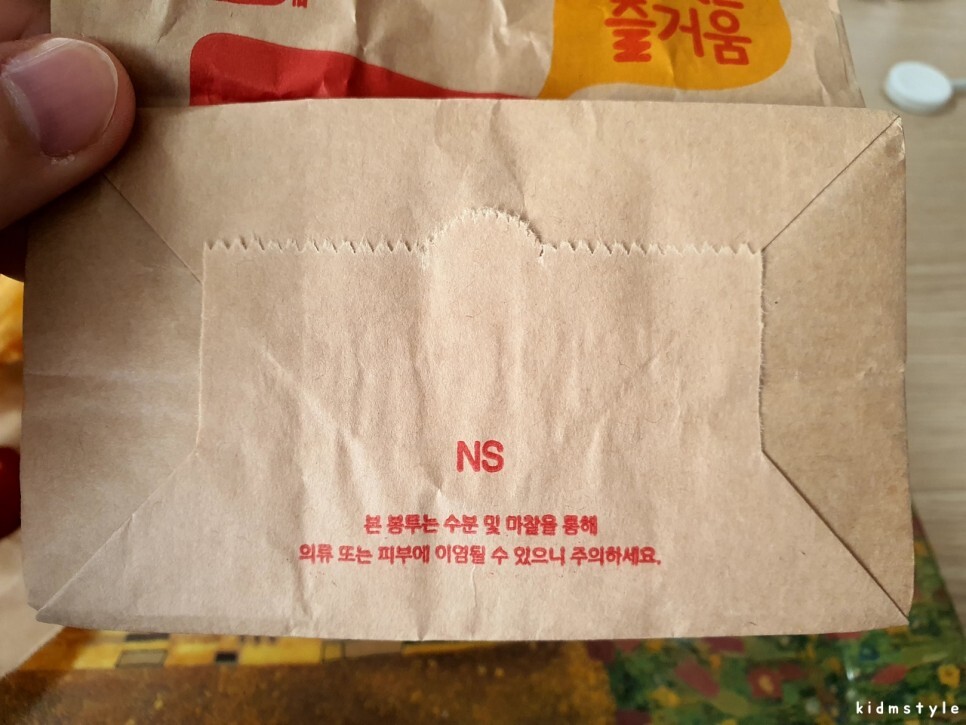 어쨌든 먹기 전에 겉봉투부터 살펴보았다. 이 봉투에 케챱 짜서 먹으면 안 좋다. 질 좋은 종이가 아니다. 종이 회사에 다니는 친구에게 귀에 따까리가 앉도록 들은 이야기이다.