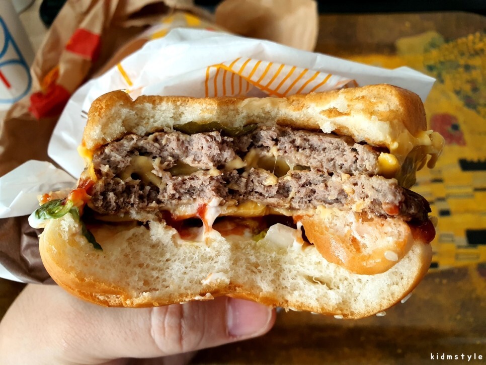 반쯤 먹었을 때 속의 모습이다. 패티가 2장, 재료도 많고 전반적으로 푸짐하다. 쇠고기는 호주산이며 이 햄버거 세트의 총 칼로리는 1,125kcal이다. 참고하기 바란다.