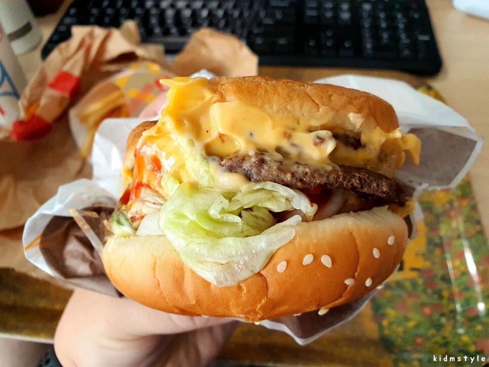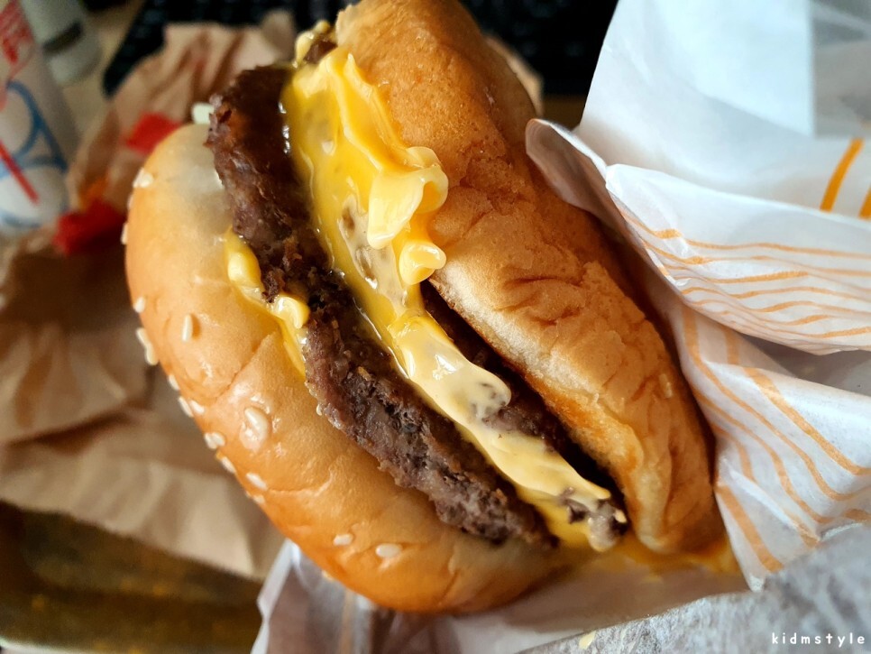 비주얼 보소~ 치즈가 녹아있는 모습이 아주 군침을 돌게 만든다. 햄버거가 크고 양이 많아 보인다.