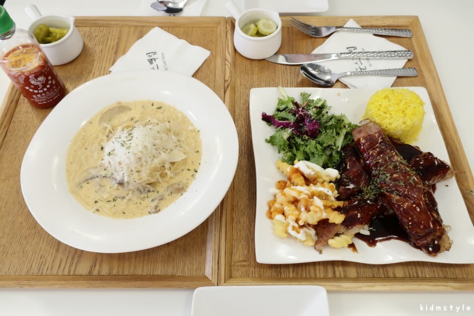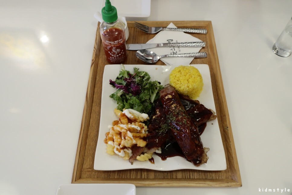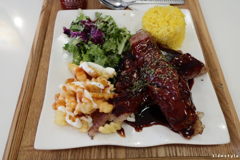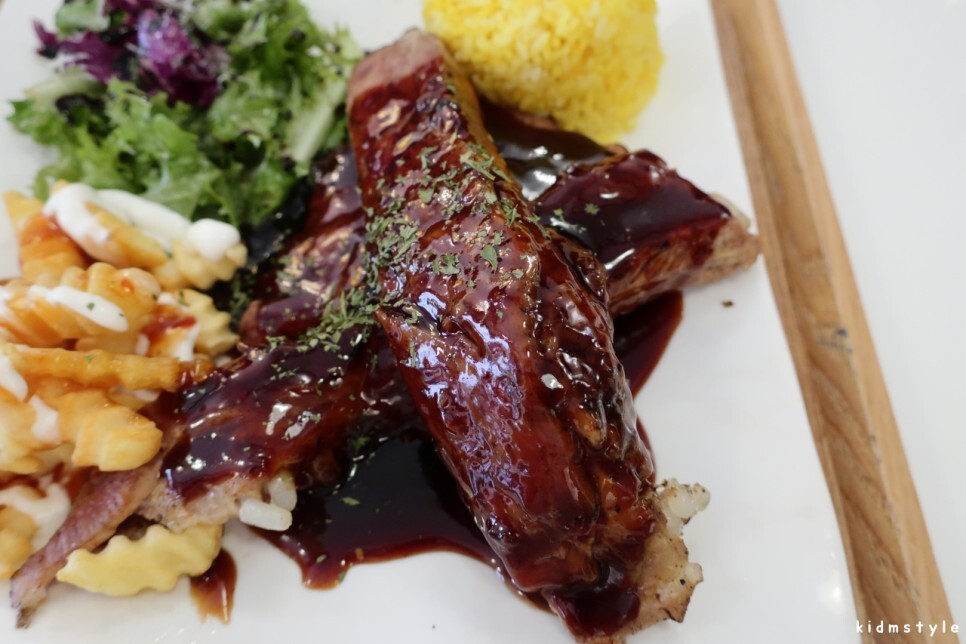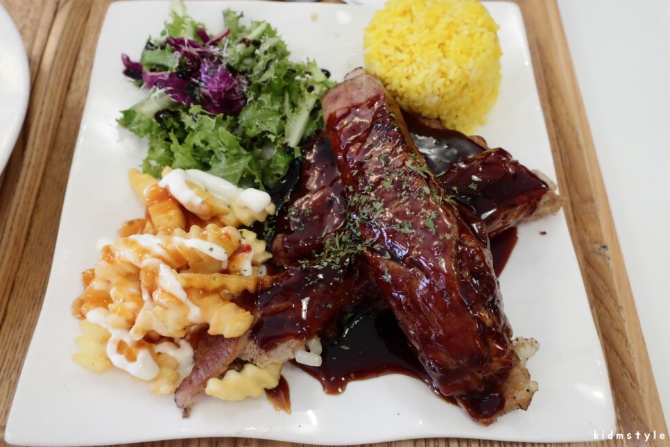 아주 먹음직스럽다. 샐러드, 감자튀김, 립, 노란밥까지 완벽하다.