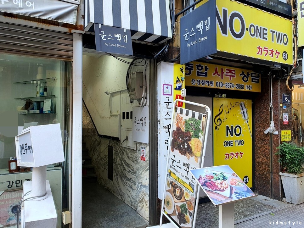 크리스마스 트리가 서는 광복로 시티스팟에서 골목으로 들어가면 된다. 강민주 헤어라고 미용실이 보이는데 그곳 2층이 오늘 가볼 군스빽립이다.