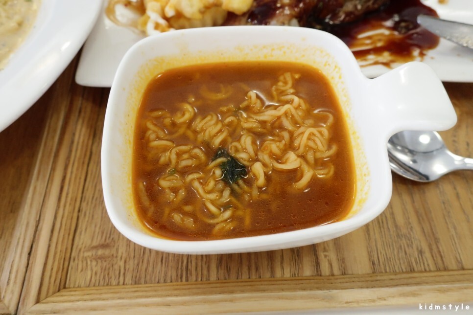 그 사이에 립 구성에 포함된 라면 1/4개가 나왔다. 이 라면이 꿀맛이더라. 느끼함을 제대로 잡아주며 매콤한 라면, 안성탕면인 것 같은데 라면만 따로 메뉴로 출시했으면 하는 바람이 있다. 상당히 잘 끓인 라면이다.