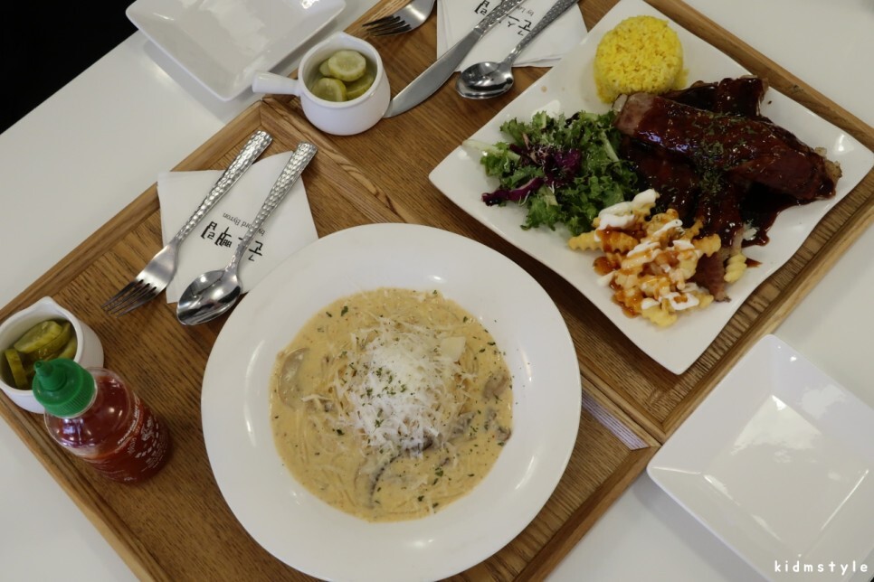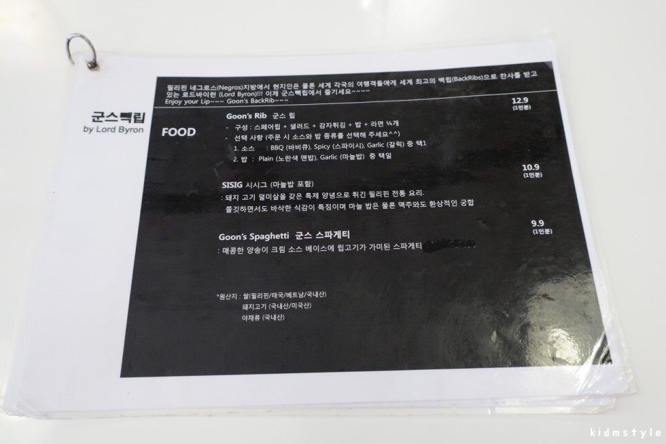 메뉴판이다. 메뉴는 상당히 간단하다. 군스 립 1인분 (12,900원)과 군스 스파게티 (9,900원)을 주문하였다. 립 소스는 비비큐, 밥은 노란색 밥으로 선택했다.