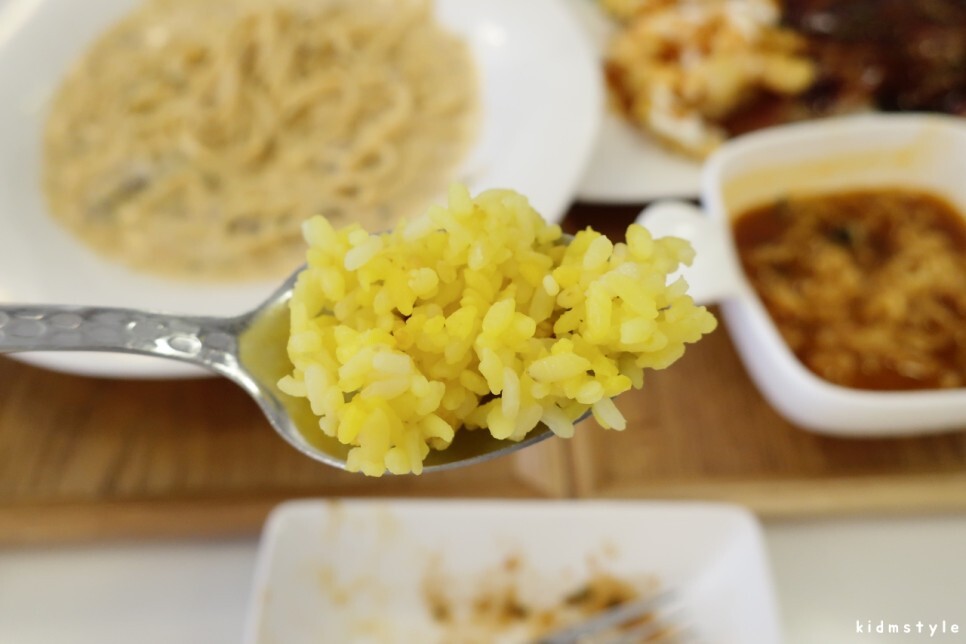 노란 밥도 꽤 괜찮네. 심심하지 않고 약간 양념이 된 듯한 살짝 짭짤함이 느껴지는 입맛 돋우는 밥이다.
