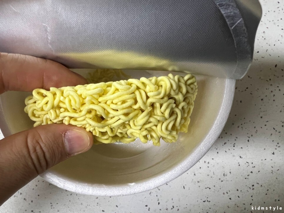 2. 4분 후 뚜껑에 표시된 화살표 부분을 잡고 뜯어내어 물을 버린다.