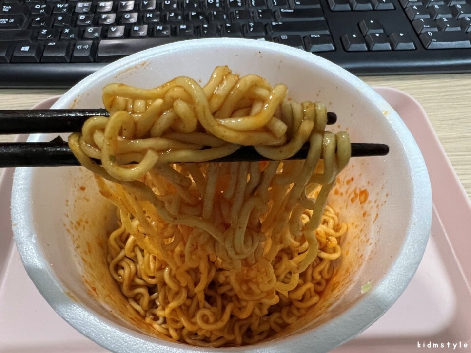 오뚜기 스파게티 컵라면과 양은 비슷하다. 국물이 없어서 양이 적어 보이고 실제로 양이 적다. 매콤한 소스가 참 괜찮다. 밀가루 면에서 느낄 수 있는 느끼함을 소스가 딱 잡아준다.