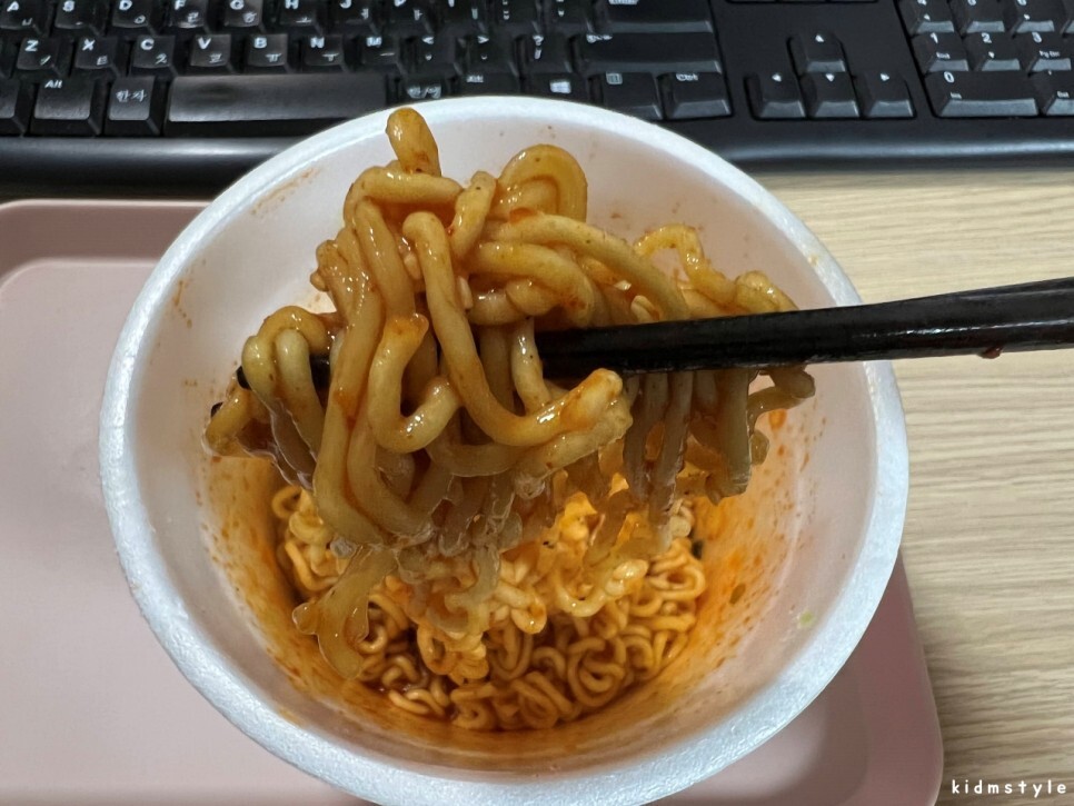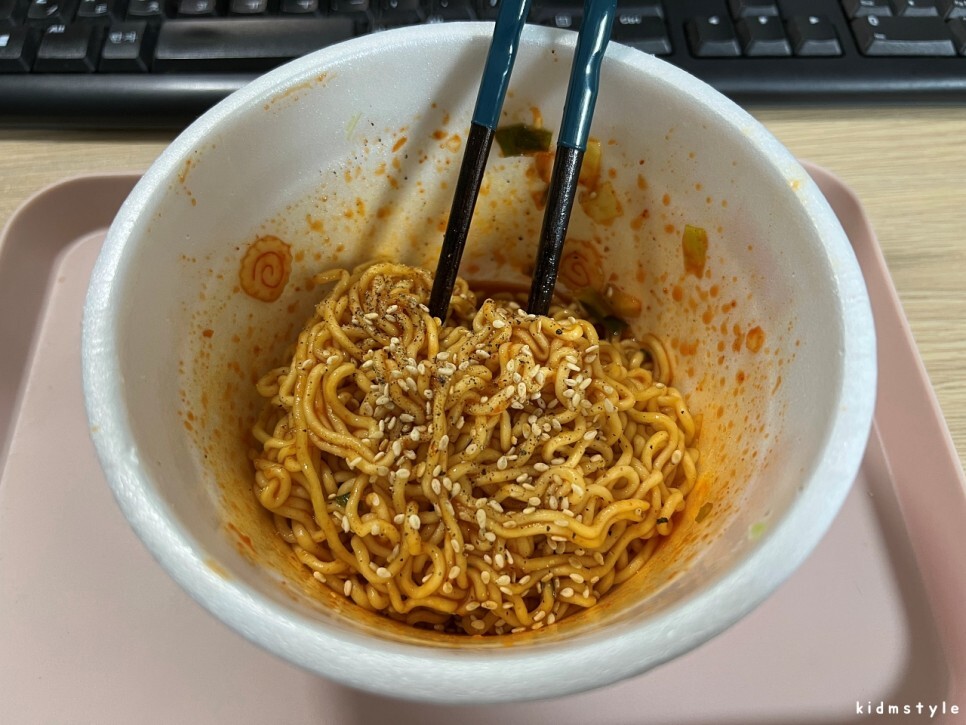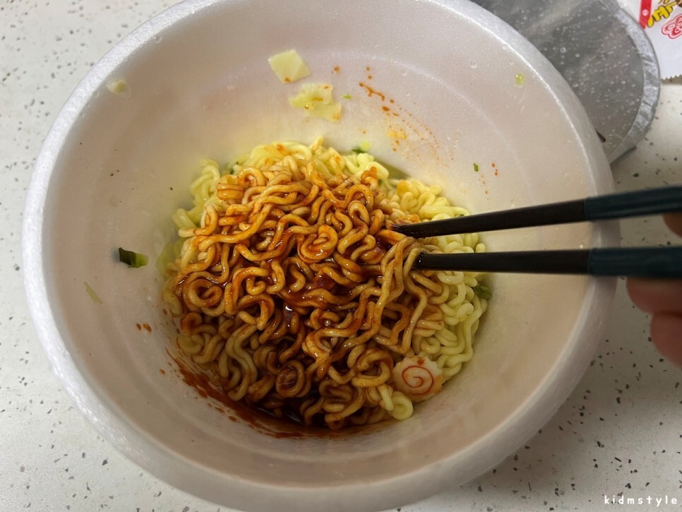 준비하는데 시간이 5분 넘게 걸리고 먹는데 3분 걸렸나? 그냥 순삭이다. 한 끼 식사 대용으로 먹으려면 3개 정도 먹어야 할 것 같다. 다 먹고 나니 매콤함이 입가에 맴돈다. 간식으로 먹기가 참 좋은데 맵찔이들은 유의할 것! 정말 입맛 돋우기 딱 좋은 간식이다. 요즘 어린이들에게 상당히 인기가 많은 간식이라고 하는데 어른이 먹어보면 더 맛있어 할 것 같은 제품이다. 맛있게 잘 먹었다.