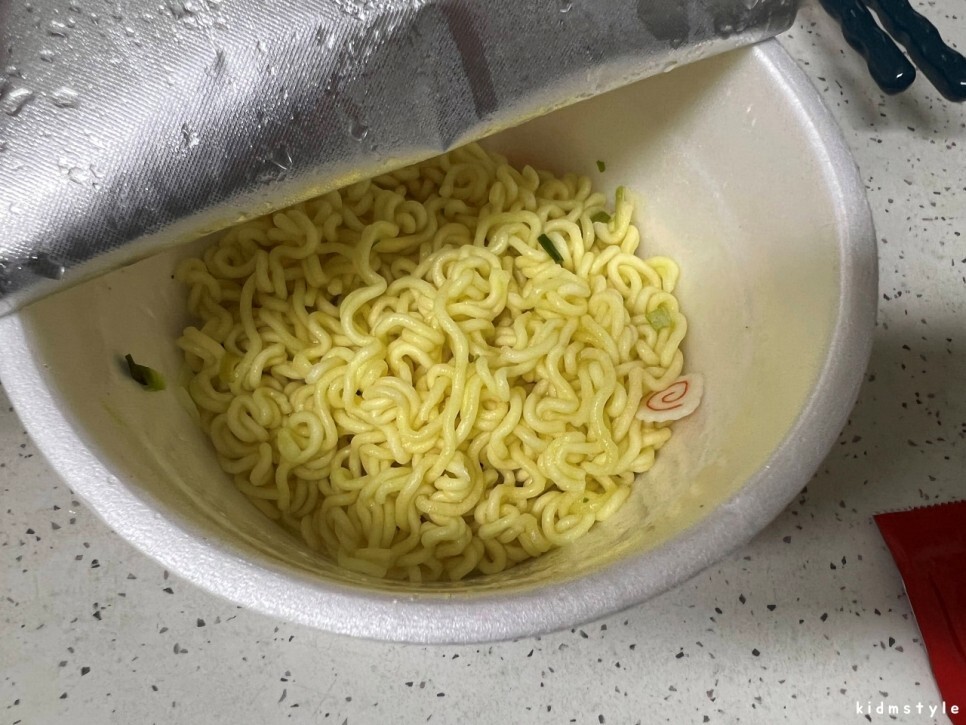 건더기스프를 뜯어서 부었다. 나루토 고명이 4개 정도, 그리고 파 등 채소가 들어가 있다.