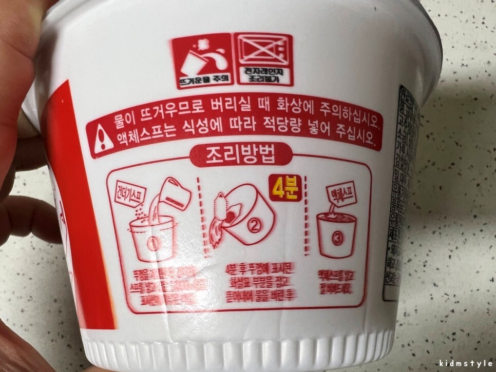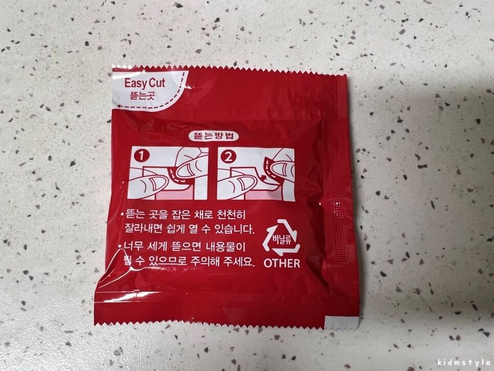 4분을 기다리면서 액체스프를 살펴본다. easy cut 뜯는곳이라고 적힌 부분을 잡고 절대 스프를 흔들지 말기 바란다. 전에 무심결에 저 부분을 잡고 스프를 흔들었다가 주방 공간에 온 사방에 스프가 튀어서 식겁한 적이 있다. 비빔면 소스였나 그럴 것이다.