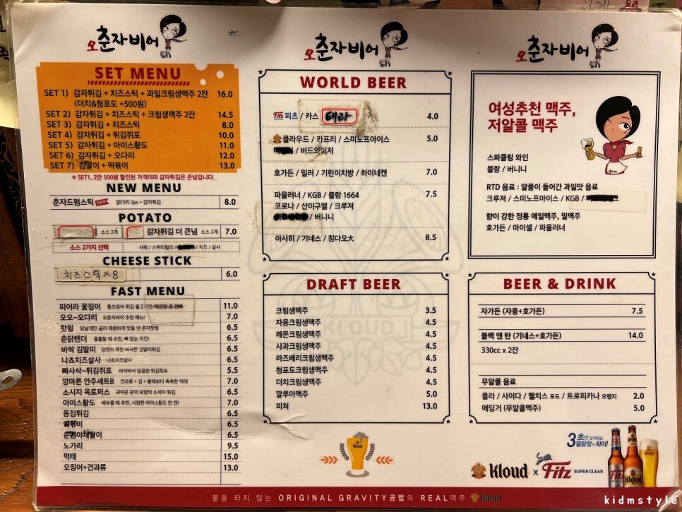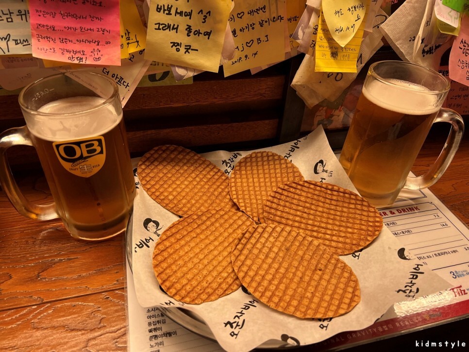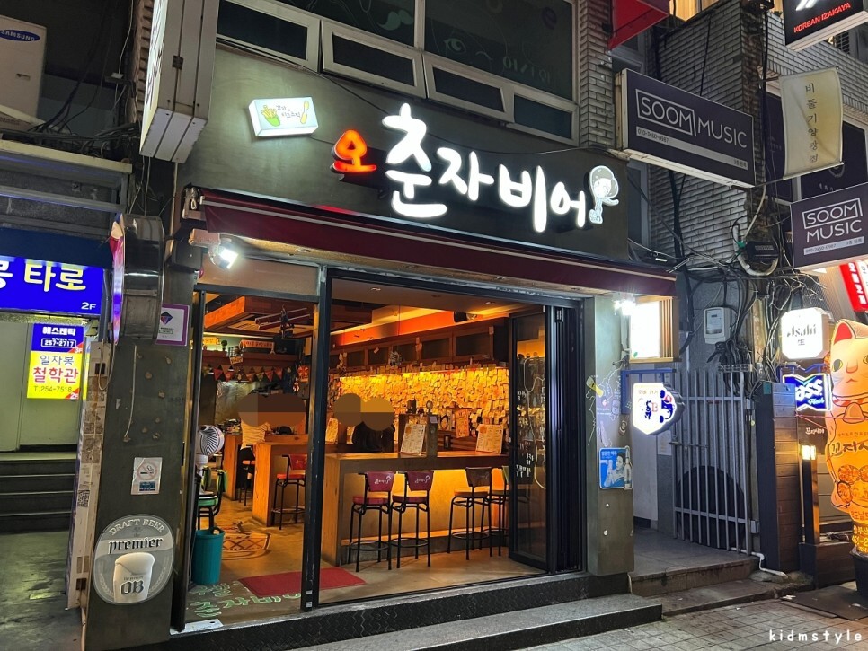 부산극장 뒷골목에 있다. 오른쪽으로는 얼마 전 이전한 어울렁꼬지가 자리하고 있다. 손님이 몇 팀 있었는데 시끌벅적한 분위기가 아니라서 바로 들어가 보기로 했다. 오 춘자비어는 체인점인데 대신동 삼익맨션 상가에 있는 매장을 자주 갔기 때문에 반갑더라.