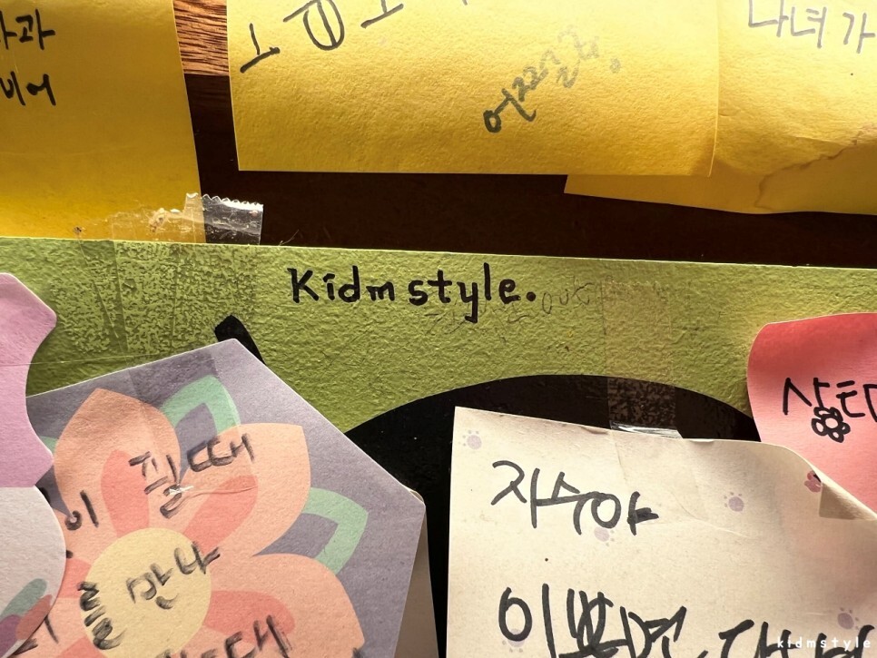 포스트잇에 한마디 메모를 남겨서 붙이고 kidmstyle도 한번 적어보았다. 메모는 다음에 또 가서 그 자리에 앉으면 찾아볼 생각이다.