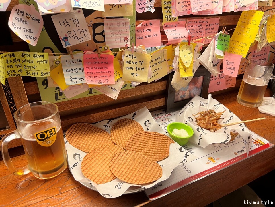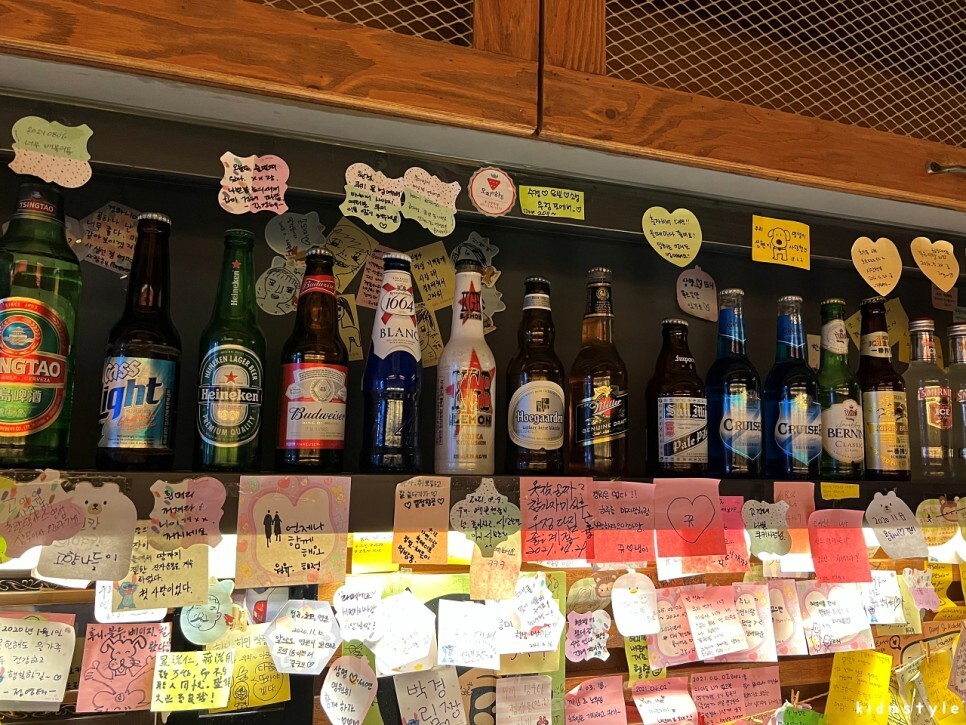 스몰비어에 가면 자주 볼 수 있는 풍경이다. 포스트잇으로 빼곡하게 붙어있는데 떨어지지 않게 테이프로 잘 붙여놓은 모습이 인상적이었다. 하나하나 글을 적어서 추억을 메모해놓은 손님들의 기록을 잘 보존하려는 사장님의 따뜻한 마음이 엿보이는 부분이다.