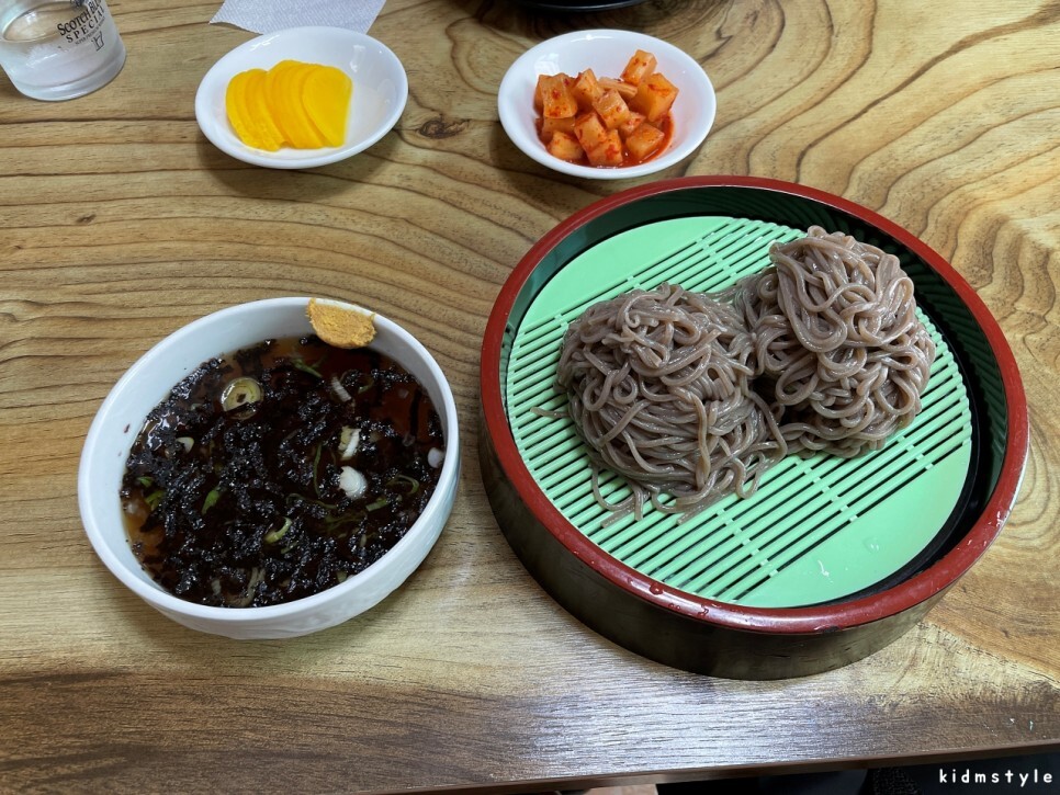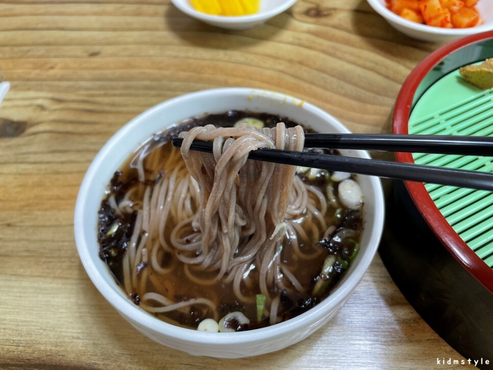이렇게 모밀면을 국물에 넣어서 먹으면 아주 꿀맛이다.