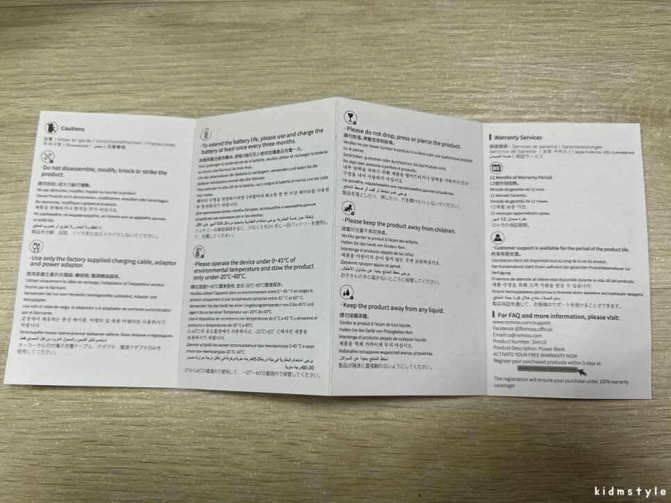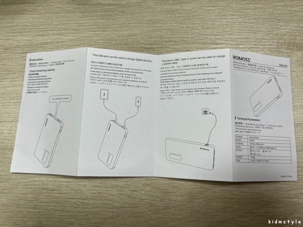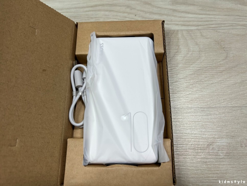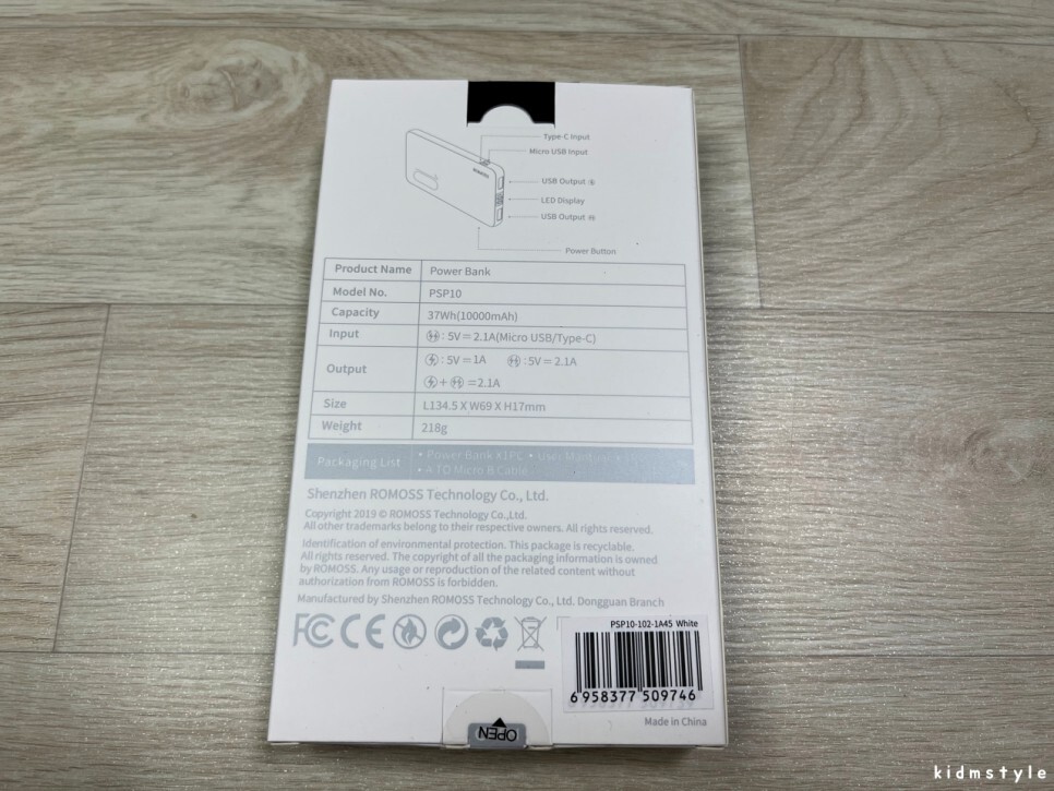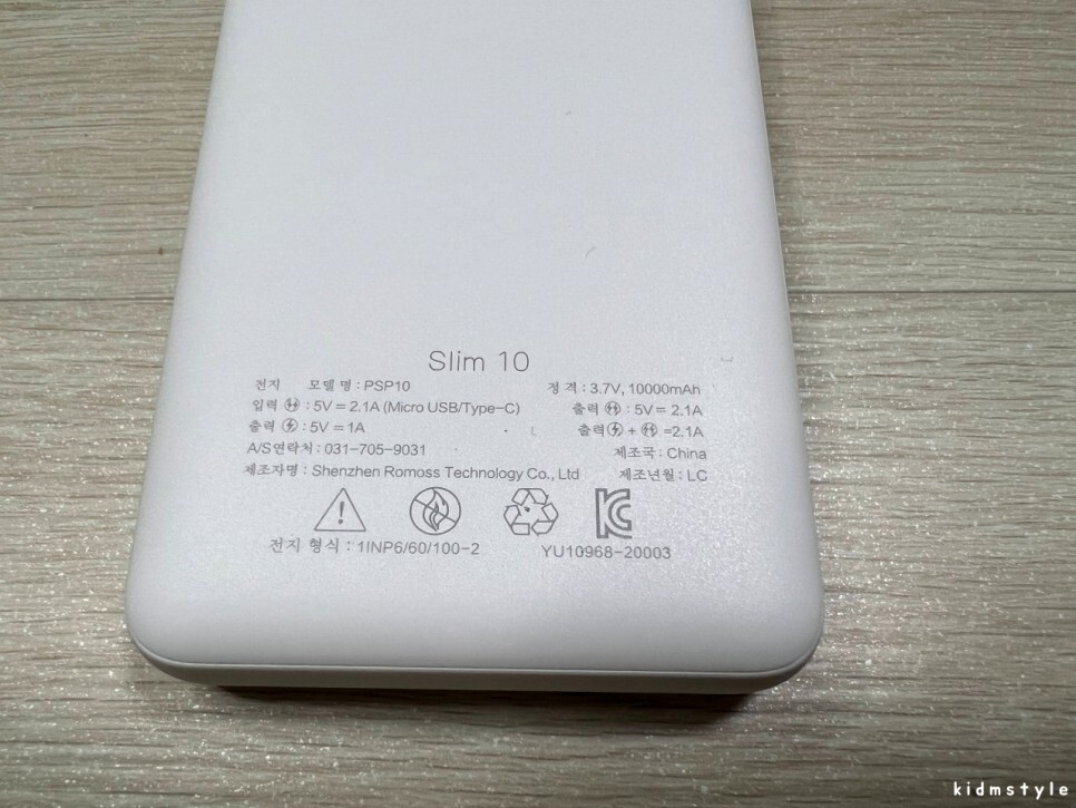 정식 수입 제품이라 kc 인증이 찍혀있다. 10000mAh 짜리 보조배터리이다. 입력은 5v, 2.1a이며 출력은 5v 1a, 5v 2.1a가 가능하다. 최대 10.5w 출력이니 사용하기에 무리가 없는 정도이다.