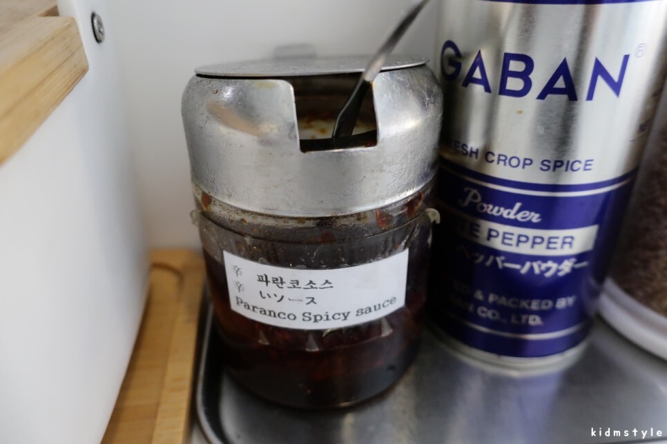 파란코 소스라는 매운 소스도 제공된다. 옆에는 백후추.