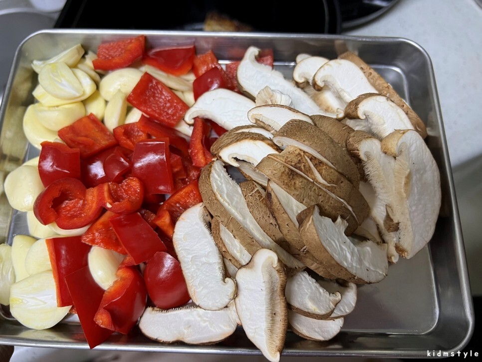 채소도 같이 굽는다. 마늘, 파프리카, 표고버섯을 썰어준다.