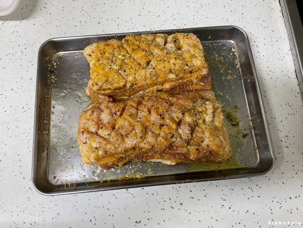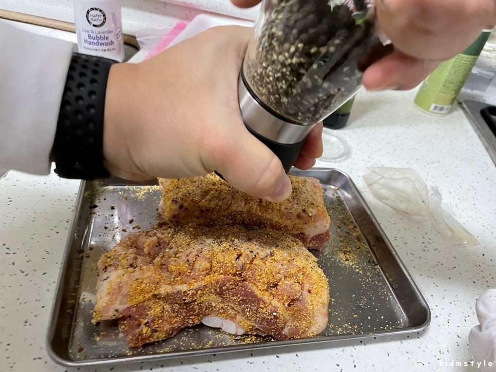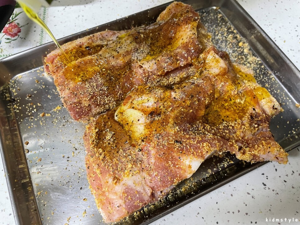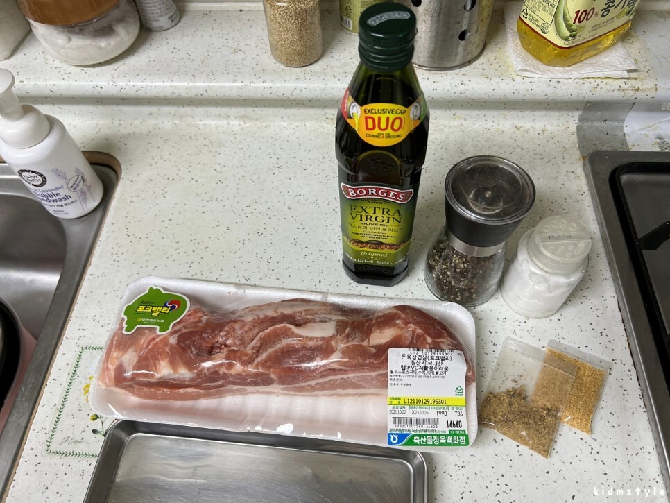 준비물은 간단하다. 올리브오일, 통후추, 소금, 향신료 등과 삼겹살이다.