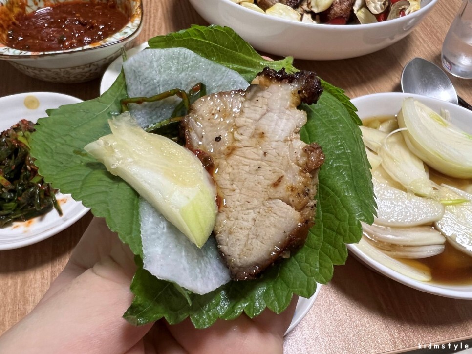 먼저 깻잎과 쌈무에 한 쌈 싸 먹어본다. 꿀맛이다.