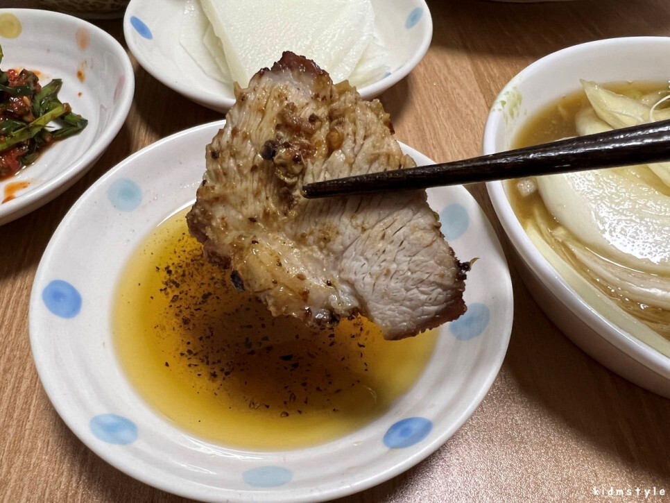 기름장에 찍어서 맛보니 아주 맛있다. 고기의 기름이 쫙 빠져서 상당히 담백하고 고소하고 맛이 있다.