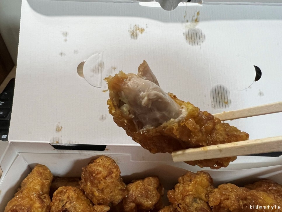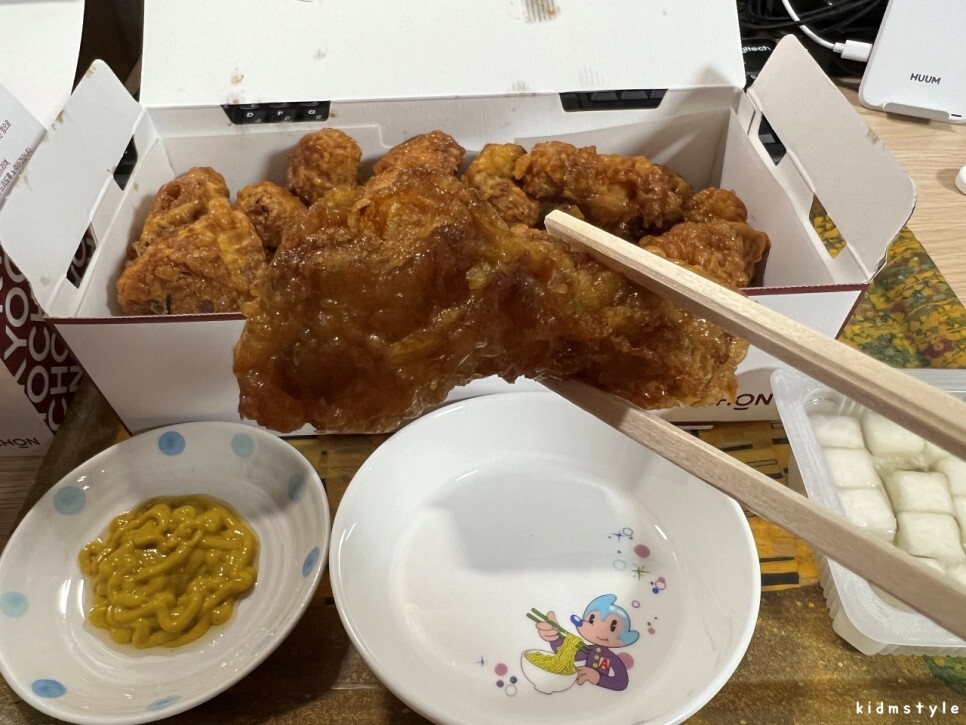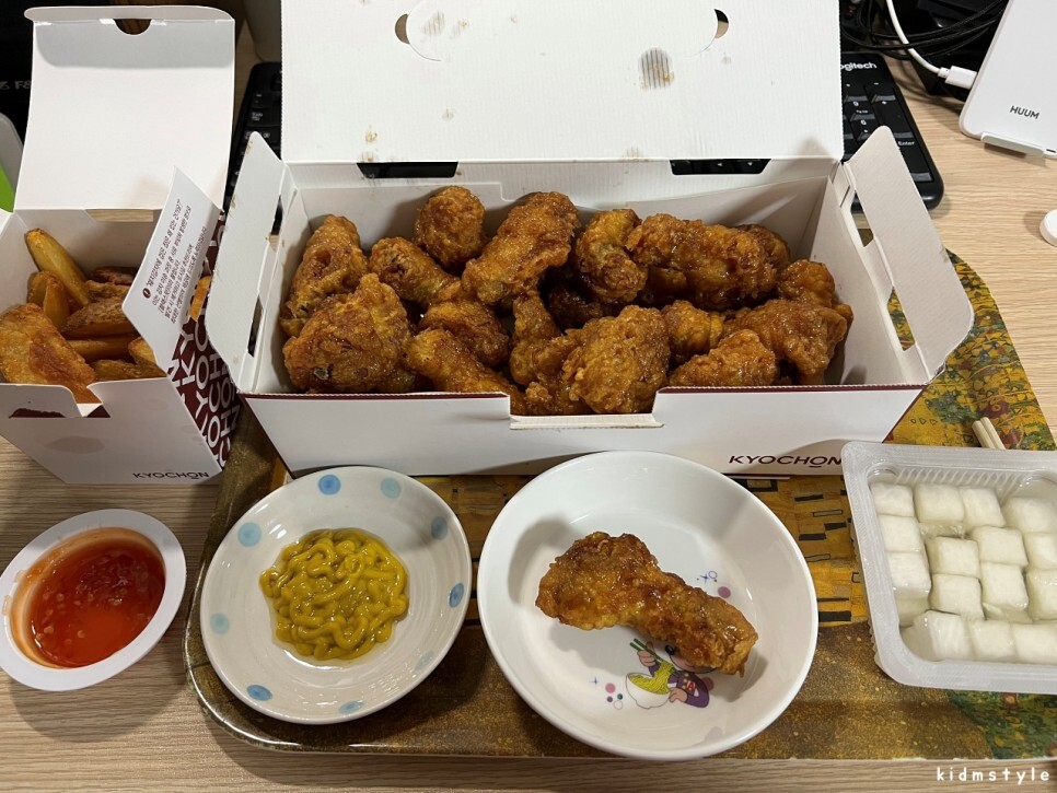냉장고에서 허니머스타드 소스 준비해와서 찍어 먹어본다. 오래간만에 먹어보는데 맛이 있다. 교촌 살아있네~