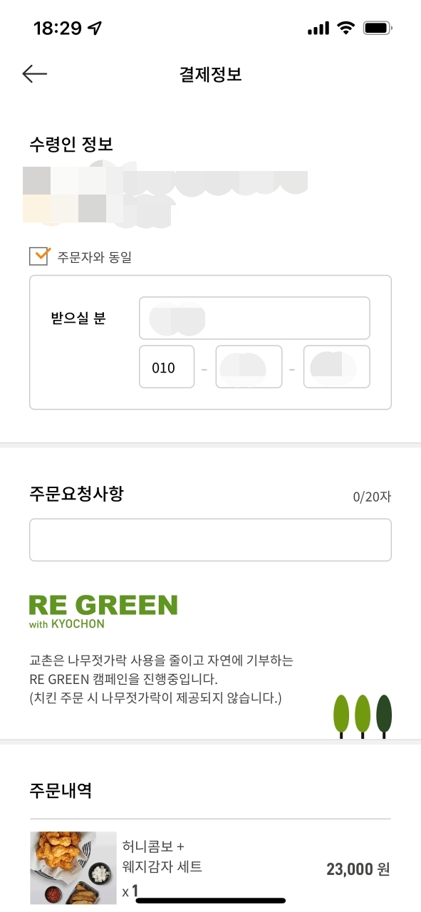 현금영수증 정보를 입력하고 배달료 2천 원을 추가로 결제한다.