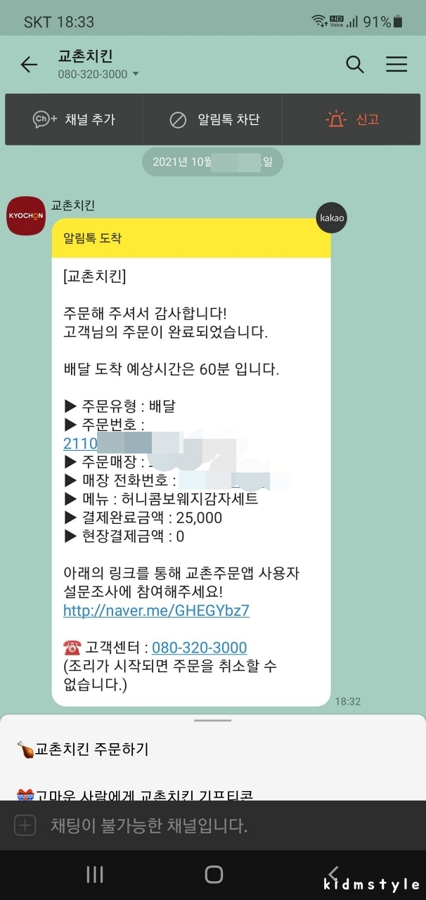 세컨폰으로 카톡이 날아왔다. 교촌은 배달 시간이 기본 1시간이다. 왜 잘 아는가? 본가에 부모님은 거의 교촌만 드시기 때문에 얘기를 많이 들었다.