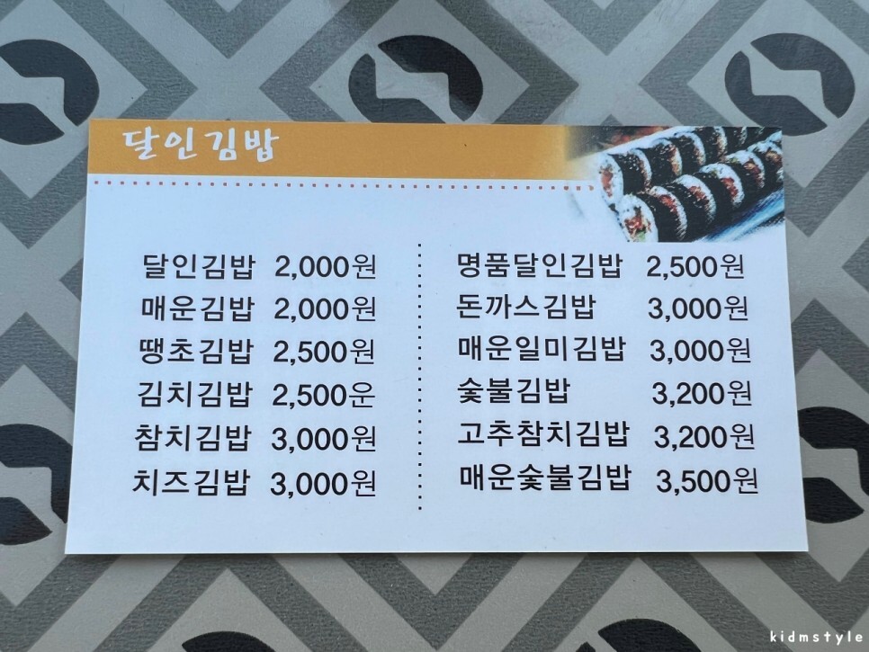 가장 기본 메뉴인 달인김밥 역시 내용물이 실하다. 돼도 안 하게 넣고 1,500원, 2천 원 받는 다른 집들보다 비주얼적인 입장에서는 확실히 점수를 따고 시작한다.