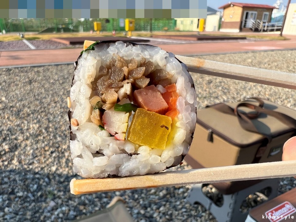 그리고 캠핑장에 도착하여 숙련된 솜씨로 빠른 속도로 텐트 및 기본 세팅을 끝내는 등 사이트 구축을 완료하였다. 늦은 점심이지만 김밥을 제대로 맛볼 시간이 왔다.