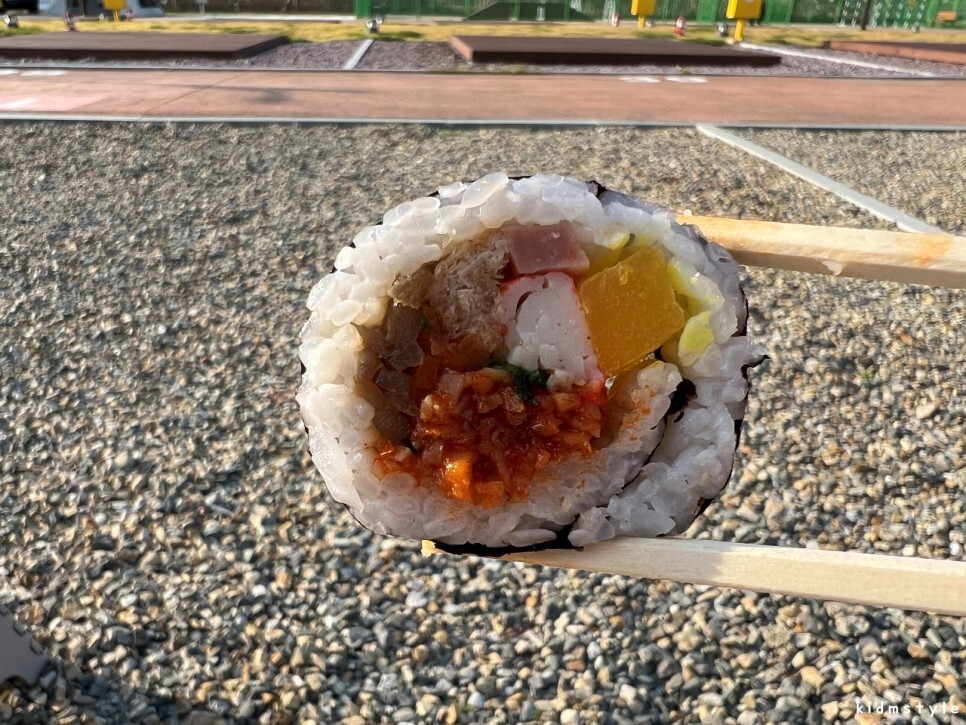 이어서 매운일미김밥이다. 유부, 햄, 맛살, 시금치, 우엉, 단무지, 일미 등이 들어가 있다. 이 김밥 역시 재료가 푸짐한 것을 눈으로 볼 수 있다. 매운일미김밥이라 약간 매콤하다. 맵찔이들은 조금 매울 수도 있겠다. 나는 원래 매운 것을 잘 먹는 편이었는데 최근 2~3년 동안 입맛이 조금 바뀌어서 매운맛에 취약했으나 올해 들어서 입맛이 다시 바뀌면서 매운맛을 다시 즐기게 되어 이 정도 맵기는 딱 괜찮은 느낌이다. 쓸데없이 맵부심을 부리는 것이 아니라 매운 것을 조금 즐길 수 있을 정도면 무난하게 맛볼 것 같다.