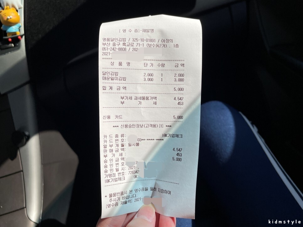 캠핑장으로 이동하면서 주워 먹어본다. 일단 둘이서 달인김밥 반줄만 먹기로 하고 반줄만 먹었다. 몇 개 먹어보니 맛이 괜찮다. 운전하면서 먹어서 그런지 더 감질나는 느낌이다.