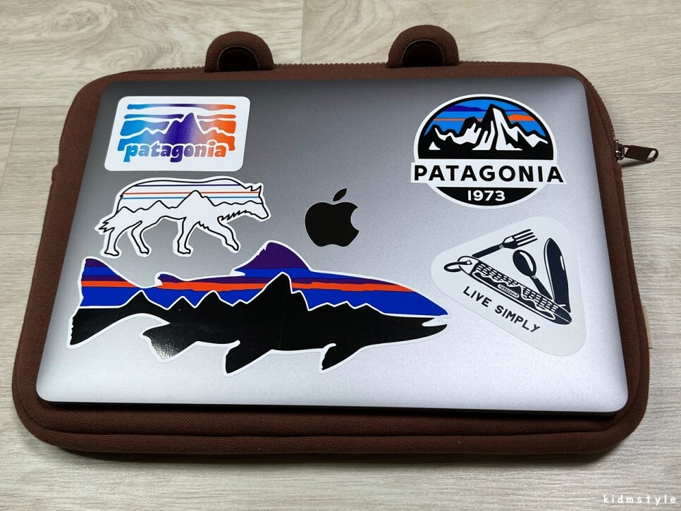 파우치 위에 m1 맥북프로 13인치를 올려보았다. 여유가 있어 보인다. 구입하자마자 맥북 상판이 밋밋해서 파타고니아 스티커를 몇 장 붙였다. 역시 노트북은 스티커질을 해야 제맛이다.